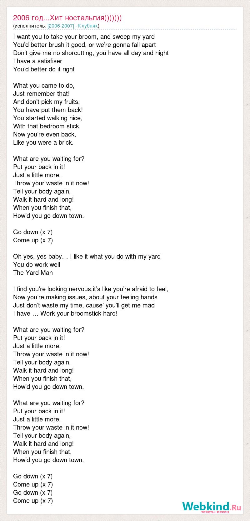 I want you to take your broom, and sweep my yard You’d better brush it good, or we’re gonna fall apart Don’t give me no shorcutting, you have all day and night I have a satisfiser You’d better do it right What you came to do, Just remember that! And don’t pick my fruits, You have put them back! You started walking nice, With that bedroom stick Now you’re even back, Like you were a brick. What are you waiting for? Put your back in it! Just a little more, Throw your waste in it now! Tell your body again, Walk it hard and long! When you finish that, How’d you go down town. Go down (х 7) Come up (х 7) Oh yes, yes baby… I like it what you do with my yard You do work well The Yard Man I find you’re looking nervous,it’s like you’re afraid to feel, Now you’re making issues, about your feeling hands Just don’t waste my time, cause’ you’ll get me mad I have … Work your broomstick hard! What are you waiting for? Put your back in it! Just a little more, Throw your waste in it now! Tell your body again, Walk it hard and long! When you finish that, How’d you go down town. What are you waiting for? Put your back in it! Just a little more, Throw your waste in it now! Tell your body again, Walk it hard and long! When you finish that, How’d you go down town. Go down (х 7) Come up (х 7) Go down (х 7) Come up (х 7)