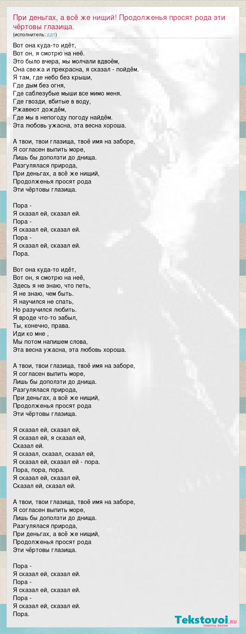 Вот она куда-то идёт, Вот он, я смотрю на неё. Это было вчера, мы молчали вдвоём, Она свежа и прекрасна, я сказал - пойдём. Я там, где небо без крыши, Где дым без огня, Где саблезубые мыши все мимо меня. Где гвозди, вбитые в воду, Ржавеют дождём, Где мы в непогоду погоду найдём. Эта любовь ужасна, эта весна хороша. А твои, твои глазища, твоё имя на заборе, Я согласен выпить море, Лишь бы доползти до днища. Разгулялася природа, При деньгах, a всё же нищий, Продолженья просят рода Эти чёртовы глазища. Пора - Я сказал ей, сказал ей. Пора - Я сказал ей, сказал ей. Пора - Я сказал ей, сказал ей. Пора. Вот она куда-то идёт, Вот он, я смотрю на неё, Здесь я не знаю, что петь, Я не знаю, чем быть. Я научился не спать, Но разучился любить. Я вроде что-то забыл, Ты, конечно, права. Иди ко мне , Мы потом напишем слова, Эта весна ужасна, эта любовь хороша. А твои, твои глазища, твоё имя на заборе, Я согласен выпить море, Лишь бы доползти до днища. Разгулялася природа, При деньгах, a всё же нищий, Продолженья просят рода Эти чёртовы глазища. Я сказал ей, сказал ей, Я сказал ей, я сказал ей, Сказал ей. Я сказал, сказал, сказал ей, Я сказал ей, сказал ей - пора. Пора, пора, пора. Я сказал ей, сказал ей, Сказал ей, сказал ей. А твои, твои глазища, твоё имя на заборе, Я согласен выпить море, Лишь бы доползти до днища. Разгулялася природа, При деньгах, a всё же нищий, Продолженья просят рода Эти чёртовы глазища. Пора - Я сказал ей, сказал ей. Пора - Я сказал ей, сказал ей. Пора - Я сказал ей, сказал ей. Пора.