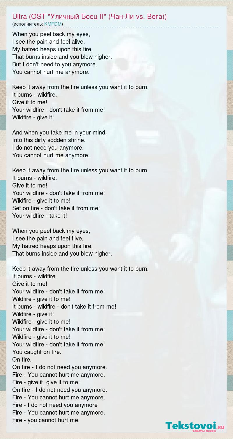 When you peel back my eyes, I see the pain and feel alive. My hatred heaps upon this fire, That burns inside and you blow higher. But I don't need to you anymore. You cannot hurt me anymore. Keep it away from the fire unless you want it to burn. It burns - wildfire. Give it to me! Your wildfire - don't take it from me! Wildfire - give it! And when you take me in your mind, Into this dirty sodden shrine. I do not need you anymore. You cannot hurt me anymore. Keep it away from the fire unless you want it to burn. It burns - wildfire. Give it to me! Your wildfire - don't take it from me! Wildfire - give it to me! Set on fire - don't take it from me! Your wildfire - take it! When you peel back my eyes, I see the pain and feel flive. My hatred heaps upon this fire, That burns inside and you blow higher. Keep it away from the fire unless you want it to burn. It burns - wildfire. Give it to me! Your wildfire - don't take it from me! Wildfire - give it to me! It burns - wildfire - don't take it from me! Wildfire - give it! Wildfire - give it to me! Your wildfire - don't take it from me! Wildfire - give it to me! Your wildfire - don't take it from me! You caught on fire. On fire. On fire - I do not need you anymore. Fire - You cannot hurt me anymore. Fire - give it, give it to me! On fire - I do not need you anymore. Fire - You cannot hurt me anymore. Fire - I do not need you anymore Fire - You cannot hurt me anymore. Fire - you cannot hurt me.