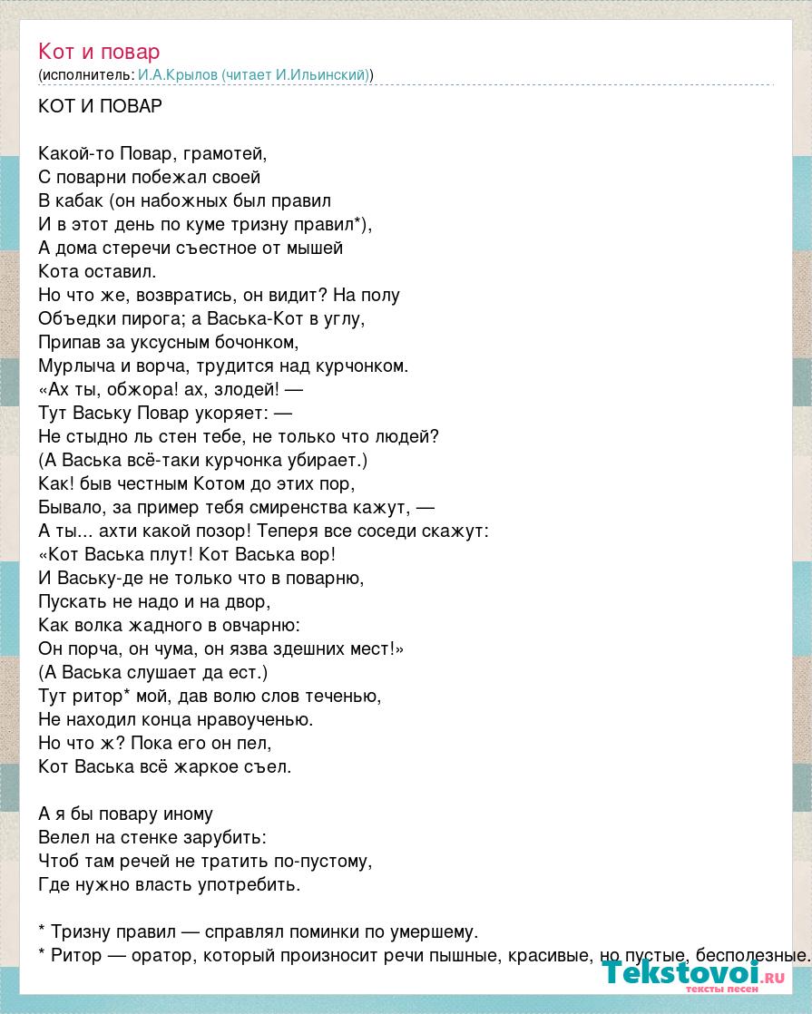 КОТ И ПОВАР Какой-то Повар, грамотей, С поварни побежал своей В кабак (он набожных был правил И в этот день по куме тризну правил*), А дома стеречи съестное от мышей Кота оставил. Но что же, возвратись, он видит? На полу Объедки пирога; а Васька-Кот в углу, Припав за уксусным бочонком, Мурлыча и ворча, трудится над курчонком. «Ах ты, обжора! ах, злодей! — Тут Ваську Повар укоряет: — Не стыдно ль стен тебе, не только что людей? (А Васька всё-таки курчонка убирает.) Как! быв честным Котом до этих пор, Бывало, за пример тебя смиренства кажут, — А ты... ахти какой позор! Теперя все соседи скажут: «Кот Васька плут! Кот Васька вор! И Ваську-де не только что в поварню, Пускать не надо и на двор, Как волка жадного в овчарню: Он порча, он чума, он язва здешних мест!» (А Васька слушает да ест.) Тут ритор* мой, дав волю слов теченью, Не находил конца нравоученью. Но что ж? Пока его он пел, Кот Васька всё жаркое съел. А я бы повару иному Велел на стенке зарубить: Чтоб там речей не тратить по-пустому, Где нужно власть употребить. * Тризну правил — справлял поминки по умершему. * Ритор — оратор, который произносит речи пышные, красивые, но пустые, бесполезные.