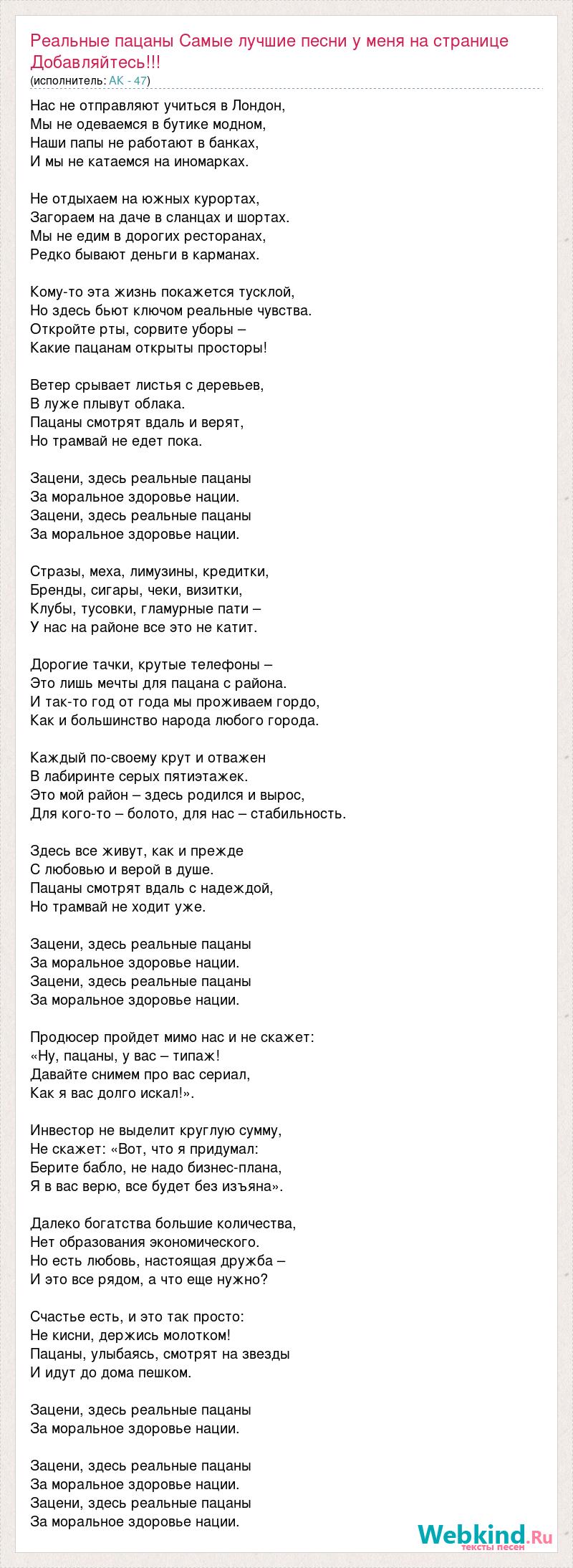 Нас не отправляют учиться в Лондон, Мы не одеваемся в бутике модном, Наши папы не работают в банках, И мы не катаемся на иномарках. Не отдыхаем на южных курортах, Загораем на даче в сланцах и шортах. Мы не едим в дорогих ресторанах, Редко бывают деньги в карманах. Кому-то эта жизнь покажется тусклой, Но здесь бьют ключом реальные чувства. Откройте рты, сорвите уборы – Какие пацанам открыты просторы! Ветер срывает листья с деревьев, В луже плывут облака. Пацаны смотрят вдаль и верят, Но трамвай не едет пока. Зацени, здесь реальные пацаны За моральное здоровье нации. Зацени, здесь реальные пацаны За моральное здоровье нации. Стразы, меха, лимузины, кредитки, Бренды, сигары, чеки, визитки, Клубы, тусовки, гламурные пати – У нас на районе все это не катит. Дорогие тачки, крутые телефоны – Это лишь мечты для пацана с района. И так-то год от года мы проживаем гордо, Как и большинство народа любого города. Каждый по-своему крут и отважен В лабиринте серых пятиэтажек. Это мой район – здесь родился и вырос, Для кого-то – болото, для нас – стабильность. Здесь все живут, как и прежде С любовью и верой в душе. Пацаны смотрят вдаль с надеждой, Но трамвай не ходит уже. Зацени, здесь реальные пацаны За моральное здоровье нации. Зацени, здесь реальные пацаны За моральное здоровье нации. Продюсер пройдет мимо нас и не скажет: «Ну, пацаны, у вас – типаж! Давайте снимем про вас сериал, Как я вас долго искал!». Инвестор не выделит круглую сумму, Не скажет: «Вот, что я придумал: Берите бабло, не надо бизнес-плана, Я в вас верю, все будет без изъяна». Далеко богатства большие количества, Нет образования экономического. Но есть любовь, настоящая дружба – И это все рядом, а что еще нужно? Счастье есть, и это так просто: Не кисни, держись молотком! Пацаны, улыбаясь, смотрят на звезды И идут до дома пешком. Зацени, здесь реальные пацаны За моральное здоровье нации. Зацени, здесь реальные пацаны За моральное здоровье нации. Зацени, здесь реальные пацаны За моральное здоровье нации.