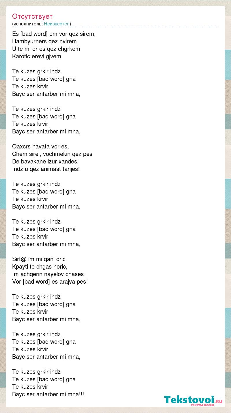 Es aprum em vor qez sirem, Hambyurners qez nvirem, U te mi or es qez chgrkem Karotic erevi gjvem Te kuzes grkir indz Te kuzes heru gna Te kuzes krvir Bayc ser antarber mi mna, Te kuzes grkir indz Te kuzes heru gna Te kuzes krvir Bayc ser antarber mi mna, Qaxcrs havata vor es, Chem sirel, vochmekin qez pes De bavakane izur xandes, Indz u qez animast tanjes! Te kuzes grkir indz Te kuzes heru gna Te kuzes krvir Bayc ser antarber mi mna, Te kuzes grkir indz Te kuzes heru gna Te kuzes krvir Bayc ser antarber mi mna, Sirt@ im mi qani oric Kpayti te chgas noric, Im achqerin nayelov chases Vor sirum es arajva pes! Te kuzes grkir indz Te kuzes heru gna Te kuzes krvir Bayc ser antarber mi mna, Te kuzes grkir indz Te kuzes heru gna Te kuzes krvir Bayc ser antarber mi mna, Te kuzes grkir indz Te kuzes heru gna Te kuzes krvir Bayc ser antarber mi mna!!!