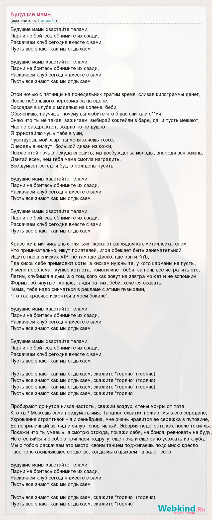 Будущие мамы хвастайте телами, Парни не бойтесь обнимите их сзади, Раскачаем клуб сегодня вместе с вами Пусть все знают как мы отдыхаем Будущие мамы хвастайте телами, Парни не бойтесь обнимите их сзади, Раскачаем клуб сегодня вместе с вами Пусть все знают как мы отдыхаем Этой ночью с пятницы на понедельник тратим время, сливая килограммы денег, После небольшого перфоманса на сцене, Восседая в клубе с моделью на колене, беби, Обьяснишь, научишь, почему вы любите что б вас считали с**ми, Знаю что ты не такая, зажигаем, выбирай коктейли в баре, да, и пусть мешают, Нас не раздражает, жарко но не душно Я фристайлю чушь тебе в уши, Чувствуешь мой жар, ты меня хочешь тоже, Очередь в чилаут, большой диван из кожи, Позже этой ночью некуда спешить, мы возбуждены, молоды, впереди вся жизнь, Двигай всем, чем тебя мама смогла наградить. Все думают сегодня будто рождены тусить Будущие мамы хвастайте телами, Парни не бойтесь обнимите их сзади, Раскачаем клуб сегодня вместе с вами Пусть все знают как мы отдыхаем Будущие мамы хвастайте телами, Парни не бойтесь обнимите их сзади, Раскачаем клуб сегодня вместе с вами Пусть все знают как мы отдыхаем Красотки в минимальных плятьях, ласкают взглядом как металлоикателем, Что примичательно, ищут приятелей, игра обещает быть занемательной, Ищите нас в списках VIP, не там где Диско, где рэп и r'n'b, Где кисок себе примеряют коты, а кискам нужны те, у кого карманы не пусты, У меня проблема - купюр котлета, помоги мне , беби, за ночь все истратить это, Летим, клубимся в дым, а о том, кого как зовут на завтра может и не вспомним, Формы, обтянутые тканью, глядя на них, беби, хочется сказать: "мама, тебе надо сниматься в рекламе с этими пузырями, Что так красиво искрятся в моем бокале". Будущие мамы хвастайте телами, Парни не бойтесь обнимите их сзади, Раскачаем клуб сегодня вместе с вами Пусть все знают как мы отдыхаем Будущие мамы хвастайте телами, Парни не бойтесь обнимите их сзади, Раскачаем клуб сегодня вместе с вами Пусть все знают как мы отдыхаем Пусть все знают как мы отдыхаем, скажите "горячо" (горячо) Пусть все знают как мы отдыхаем, скажите "горячо" (горячо) Пусть все знают как мы отдыхаем, скажите "горячо" (горячо) Пусть все знают как мы отдыхаем, скажите "горячо" Пробирают до нутра низов частоты, свежий воздух, стены мокры от пота. Кто ты? Можешь сама придумать имя. Танцпол охватил пожар, мы в его середине, Укрощение страптивой - я и сеньёрина, мне очень нравится ее сережка в пуповине, Ее неприличный взгляд и силуэт спортивный. Эфория подогрета как после текиллы. Покажи что ты умеешь, я смотрю отсюда, покажи себя, не бойся, ревновать не буду, Не стесняйся и с собою пригласи подругу, еще ночь и еще рано уезжать из клуба, Мы с тобою раскачаем это место, своим танцем поджигаешь подо мною кресло Твое тело оживляющее средство, когда мы отдыхаем - в зале тесно Будущие мамы хвастайте телами, Парни не бойтесь обнимите их сзади, Раскачаем клуб сегодня вместе с вами Пусть все знают как мы отдыхаем Пусть все знают как мы отдыхаем, скажите "горячо" (горячо) Пусть все знают как мы отдыхаем, скажите "горячо"