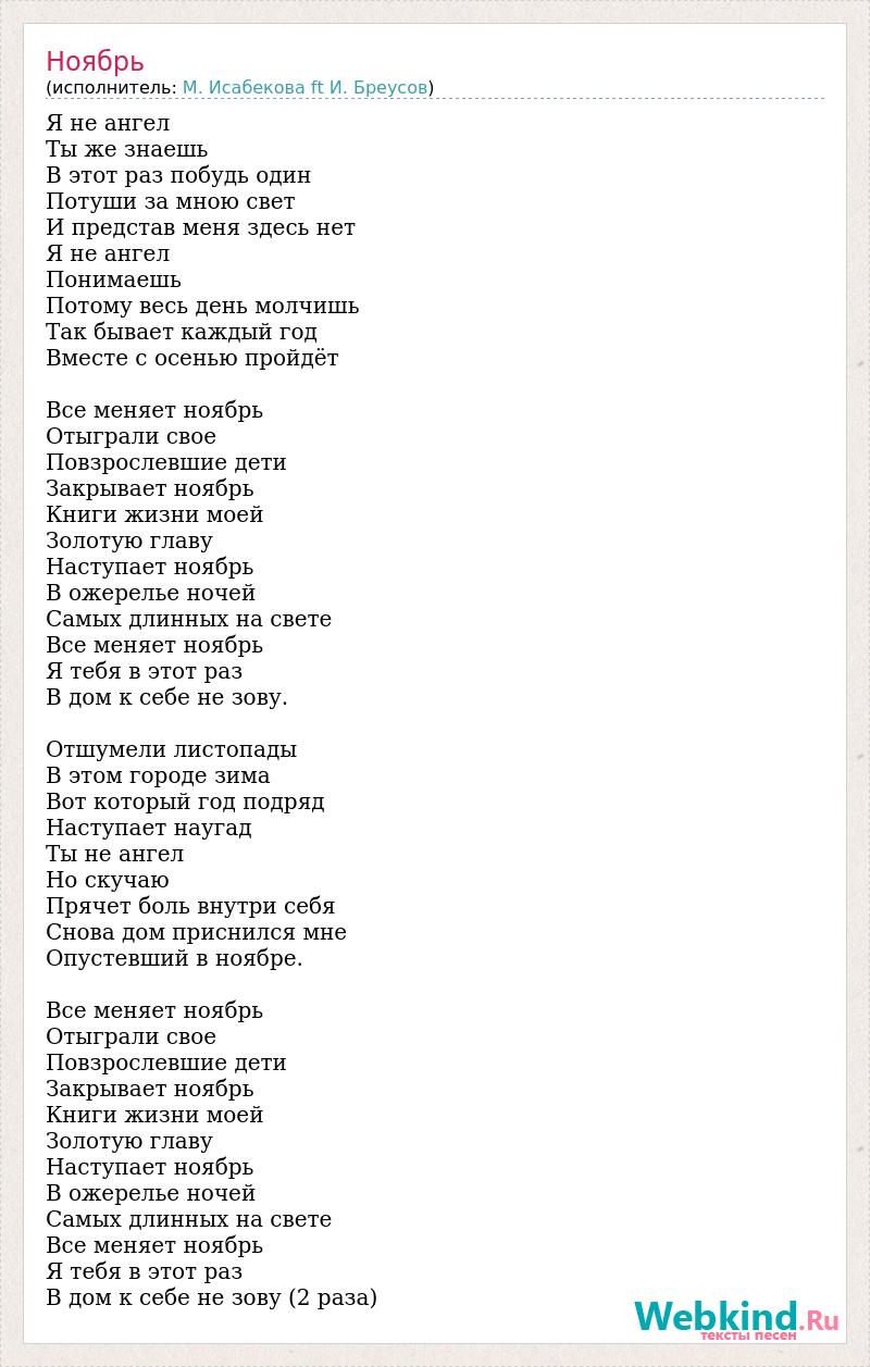 Я не ангел Ты же знаешь В этот раз побудь один Потуши за мною свет И представ меня здесь нет Я не ангел Понимаешь Потому весь день молчишь Так бывает каждый год Вместе с осенью пройдёт Все меняет ноябрь Отыграли свое Повзрослевшие дети Закрывает ноябрь Книги жизни моей Золотую главу Наступает ноябрь В ожерелье ночей Самых длинных на свете Все меняет ноябрь Я тебя в этот раз В дом к себе не зову. Отшумели листопады В этом городе зима Вот который год подряд Наступает наугад Ты не ангел Но скучаю Прячет боль внутри себя Снова дом приснился мне Опустевший в ноябре. Все меняет ноябрь Отыграли свое Повзрослевшие дети Закрывает ноябрь Книги жизни моей Золотую главу Наступает ноябрь В ожерелье ночей Самых длинных на свете Все меняет ноябрь Я тебя в этот раз В дом к себе не зову (2 раза)