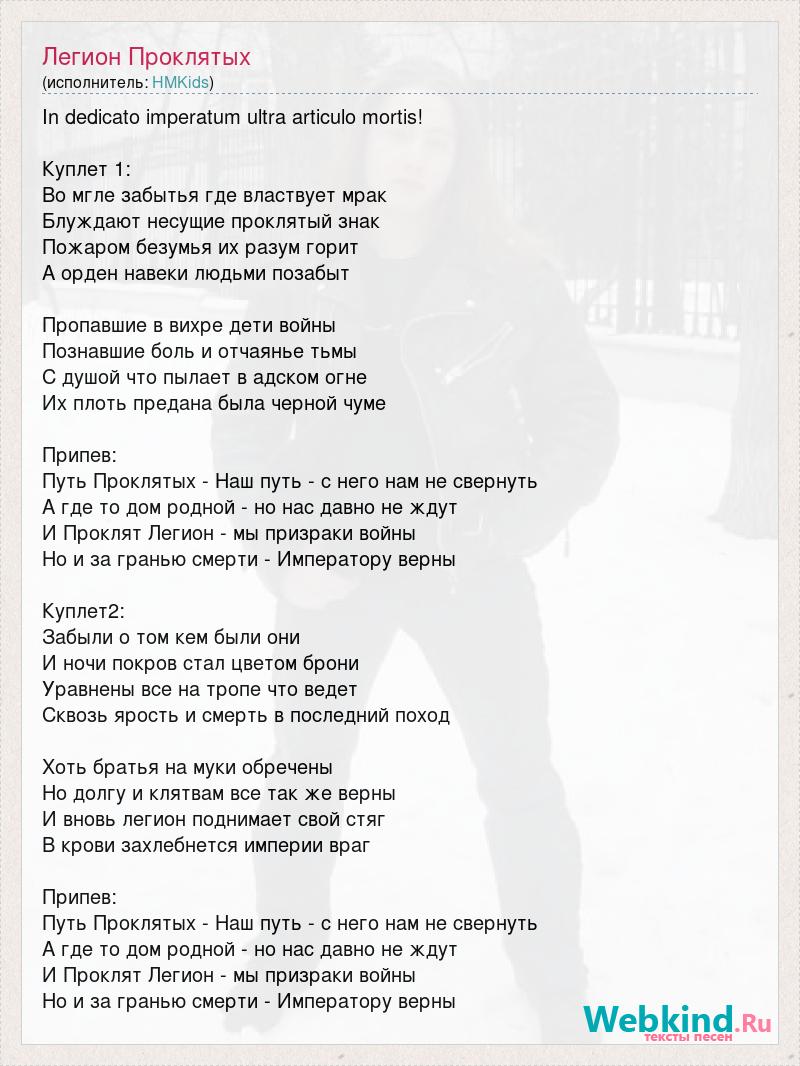 In dedicato imperatum ultra articulo mortis! Куплет 1: Во мгле забытья где властвует мрак Блуждают несущие проклятый знак Пожаром безумья их разум горит А орден навеки людьми позабыт Пропавшие в вихре дети войны Познавшие боль и отчаянье тьмы С душой что пылает в адском огне Их плоть предана была черной чуме Припев: Путь Проклятых - Наш путь - с него нам не свернуть А где то дом родной - но нас давно не ждут И Проклят Легион - мы призраки войны Но и за гранью смерти - Императору верны Куплет2: Забыли о том кем были они И ночи покров стал цветом брони Уравнены все на тропе что ведет Сквозь ярость и смерть в последний поход Хоть братья на муки обречены Но долгу и клятвам все так же верны И вновь легион поднимает свой стяг В крови захлебнется империи враг Припев: Путь Проклятых - Наш путь - с него нам не свернуть А где то дом родной - но нас давно не ждут И Проклят Легион - мы призраки войны Но и за гранью смерти - Императору верны