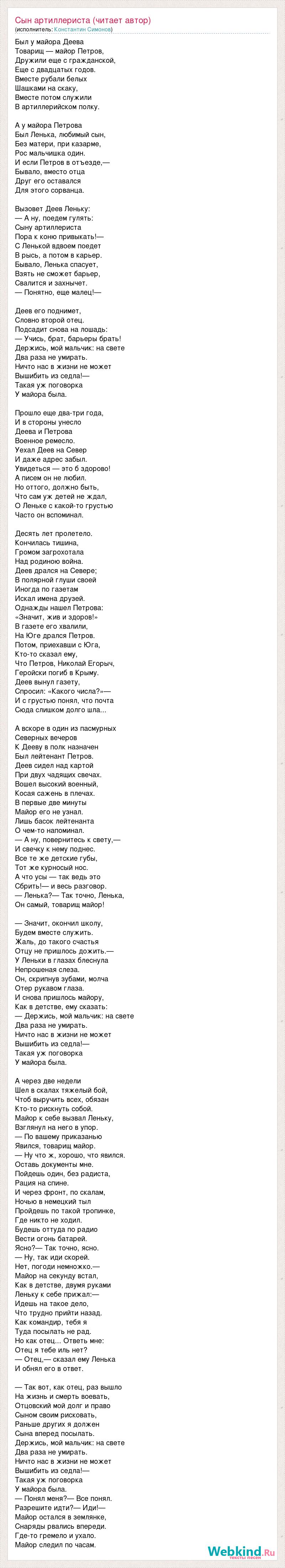 Был у майора Деева Товарищ — майор Петров, Дружили еще с гражданской, Еще с двадцатых годов. Вместе рубали белых Шашками на скаку, Вместе потом служили В артиллерийском полку. А у майора Петрова Был Ленька, любимый сын, Без матери, при казарме, Рос мальчишка один. И если Петров в отъезде,— Бывало, вместо отца Друг его оставался Для этого сорванца. Вызовет Деев Леньку: — А ну, поедем гулять: Сыну артиллериста Пора к коню привыкать!— С Ленькой вдвоем поедет В рысь, а потом в карьер. Бывало, Ленька спасует, Взять не сможет барьер, Свалится и захнычет. — Понятно, еще малец!— Деев его поднимет, Словно второй отец. Подсадит снова на лошадь: — Учись, брат, барьеры брать! Держись, мой мальчик: на свете Два раза не умирать. Ничто нас в жизни не может Вышибить из седла!— Такая уж поговорка У майора была. Прошло еще два-три года, И в стороны унесло Деева и Петрова Военное ремесло. Уехал Деев на Север И даже адрес забыл. Увидеться — это б здорово! А писем он не любил. Но оттого, должно быть, Что сам уж детей не ждал, О Леньке с какой-то грустью Часто он вспоминал. Десять лет пролетело. Кончилась тишина, Громом загрохотала Над родиною война. Деев дрался на Севере; В полярной глуши своей Иногда по газетам Искал имена друзей. Однажды нашел Петрова: «Значит, жив и здоров!» В газете его хвалили, На Юге дрался Петров. Потом, приехавши с Юга, Кто-то сказал ему, Что Петров, Николай Егорыч, Геройски погиб в Крыму. Деев вынул газету, Спросил: «Какого числа?»— И с грустью понял, что почта Сюда слишком долго шла... А вскоре в один из пасмурных Северных вечеров К Дееву в полк назначен Был лейтенант Петров. Деев сидел над картой При двух чадящих свечах. Вошел высокий военный, Косая сажень в плечах. В первые две минуты Майор его не узнал. Лишь басок лейтенанта О чем-то напоминал. — А ну, повернитесь к свету,— И свечку к нему поднес. Все те же детские губы, Тот же курносый нос. А что усы — так ведь это Сбрить!— и весь разговор. — Ленька?— Так точно, Ленька, Он самый, товарищ майор! — Значит, окончил школу, Будем вместе служить. Жаль, до такого счастья Отцу не пришлось дожить.— У Леньки в глазах блеснула Непрошеная слеза. Он, скрипнув зубами, молча Отер рукавом глаза. И снова пришлось майору, Как в детстве, ему сказать: — Держись, мой мальчик: на свете Два раза не умирать. Ничто нас в жизни не может Вышибить из седла!— Такая уж поговорка У майора была. А через две недели Шел в скалах тяжелый бой, Чтоб выручить всех, обязан Кто-то рискнуть собой. Майор к себе вызвал Леньку, Взглянул на него в упор. — По вашему приказанью Явился, товарищ майор. — Ну что ж, хорошо, что явился. Оставь документы мне. Пойдешь один, без радиста, Рация на спине. И через фронт, по скалам, Ночью в немецкий тыл Пройдешь по такой тропинке, Где никто не ходил. Будешь оттуда по радио Вести огонь батарей. Ясно?— Так точно, ясно. — Ну, так иди скорей. Нет, погоди немножко.— Майор на секунду встал, Как в детстве, двумя руками Леньку к себе прижал:— Идешь на такое дело, Что трудно прийти назад. Как командир, тебя я Туда посылать не рад. Но как отец... Ответь мне: Отец я тебе иль нет? — Отец,— сказал ему Ленька И обнял его в ответ. — Так вот, как отец, раз вышло На жизнь и смерть воевать, Отцовский мой долг и право Сыном своим рисковать, Раньше других я должен Сына вперед посылать. Держись, мой мальчик: на свете Два раза не умирать. Ничто нас в жизни не м