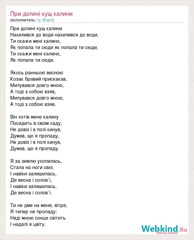 При долинi кущ калини Нахилився до води нахилився до води, Ти скажи менi калино, Як попала ти сюди як попала ти сюди, Ти скажи менi калино, Як попала ти сюди. Якось ранньою весною Козак бравий прискакав, Милувався довго мною, А тодi з собою взяв, Милувався довго мною, А тодi з собою взяв. Вiн хотiв мене калину Посадить в своiм саду, Не довiз i в полi кинув, Думав, що я пропаду, Не довiз i в полi кинув, Думав, що я пропаду. Я за землю ухопилась, Стала на ноги своi, I навiки залишилась, Де весна i солов´i, I навiки залишилась, Де весна i солов´i. Ти не дми на мене, вітре, Я тепер не пропаду: Наді мною сонце світить І надалі я цвіту.