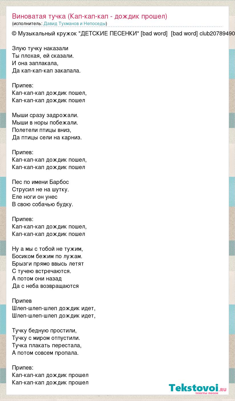 © Музыкальный кружок "ДЕТСКИЕ ПЕСЕНКИ" [bad word] [bad word] club20789490 Злую тучку наказали Ты плохая, ей сказали. И она заплакала, Да кап-кап-кап закапала. Припев: Кап-кап-кап дождик пошел, Кап-кап-кап дождик пошел Мыши сразу задрожали. Мыши в норы побежали. Полетели птицы вниз, Да птицы сели на карниз. Припев: Кап-кап-кап дождик пошел, Кап-кап-кап дождик пошел Пес по имени Барбос Струсил не на шутку. Еле ноги он унес В свою собачью будку. Припев: Кап-кап-кап дождик пошел, Кап-кап-кап дождик пошел Ну а мы с тобой не тужим, Босиком бежим по лужам. Брызги прямо ввысь летят С тучею встречаются. А потом они назад Да с неба возвращаются Припев Шлеп-шлеп-шлеп дождик идет, Шлеп-шлеп-шлеп дождик идет, Тучку бедную простили, Тучку с миром отпустили. Тучка плакать перестала, А потом совсем пропала. Припев: Кап-кап-кап дождик прошел Кап-кап-кап дождик прошел
