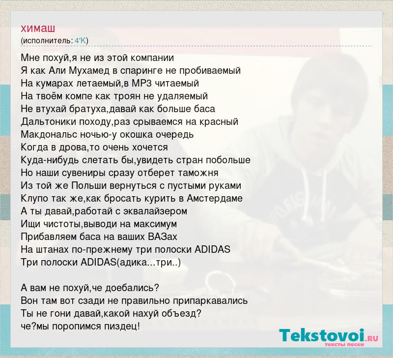 Мне похуй,я не из этой компании Я как Али Мухамед в спаринге не пробиваемый На кумарах летаемый,в MP3 читаемый На твоём компе как троян не удаляемый Не втухай братуха,давай как больше баса Дальтоники походу,раз срываемся на красный Макдональс ночью-у окошка очередь Когда в дрова,то очень хочется Куда-нибудь слетать бы,увидеть стран побольше Но наши сувениры сразу отберет таможня Из той же Польши вернуться с пустыми руками Клупо так же,как бросать курить в Амстердаме А ты давай,работай с эквалайзером Ищи чистоты,выводи на максимум Прибавляем баса на ваших ВАЗах На штанах по-прежнему три полоски ADIDAS Три полоски ADIDAS(адика...три..) А вам не похуй,че доебались? Вон там вот сзади не правильно припаркавались Ты не гони давай,какой нахуй объезд? че?мы поропимся пиздец!