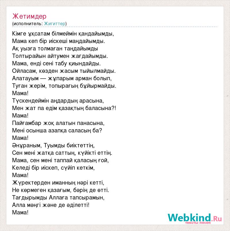 Кімге ұқсатам білмеймін қандайымды, Мама кеп бір иіскеші маңдайымды. Ақ уызға толмаған таңдайымды Толтырайын айтумен жағдайымды. Мама, енді сені табу қиындайды. Ойласам, көзден жасым тыйылмайды. Алатауым — жұпарым арман болып, Туған жерім, топырағың бұйырмайды. Мама! Түскендеймін аңдардың арасына, Мен жат па едім қазақтың баласына?! Мама! Пайғамбар жоқ алатын панасына, Мені осынша азапқа саласың ба? Мама! Әнұраным, Туымды биіктеттің, Сен мені жатқа саттың, күйікті еттің. Мама, сен мені таппай қаласың ғой, Келеді бір иіскеп, сүйіп кеткім, Мама! Жүректерден иманның нәрі кетті, Не көрмеген қазағым, бәрің де өтті. Тағдырымды Аллаға тапсырамын, Алла мәңгі және де әділетті! Мама!