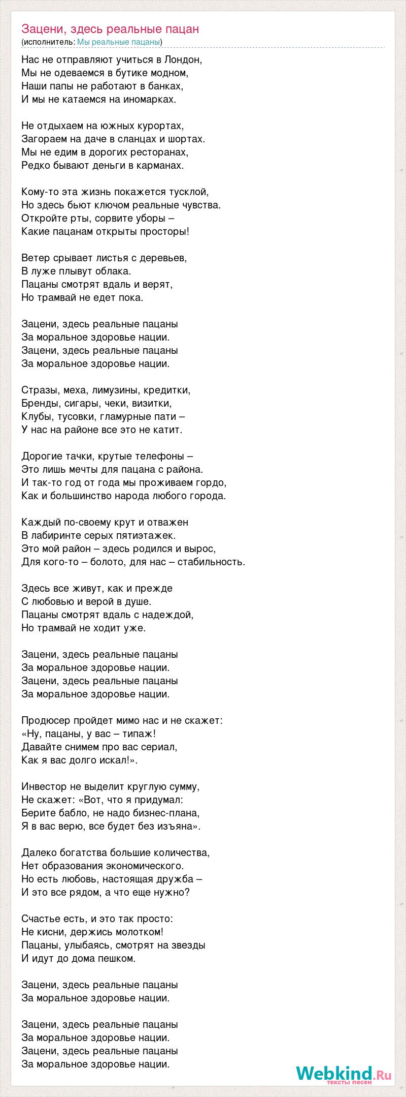 Нас не отправляют учиться в Лондон, Мы не одеваемся в бутике модном, Наши папы не работают в банках, И мы не катаемся на иномарках. Не отдыхаем на южных курортах, Загораем на даче в сланцах и шортах. Мы не едим в дорогих ресторанах, Редко бывают деньги в карманах. Кому-то эта жизнь покажется тусклой, Но здесь бьют ключом реальные чувства. Откройте рты, сорвите уборы – Какие пацанам открыты просторы! Ветер срывает листья с деревьев, В луже плывут облака. Пацаны смотрят вдаль и верят, Но трамвай не едет пока. Зацени, здесь реальные пацаны За моральное здоровье нации. Зацени, здесь реальные пацаны За моральное здоровье нации. Стразы, меха, лимузины, кредитки, Бренды, сигары, чеки, визитки, Клубы, тусовки, гламурные пати – У нас на районе все это не катит. Дорогие тачки, крутые телефоны – Это лишь мечты для пацана с района. И так-то год от года мы проживаем гордо, Как и большинство народа любого города. Каждый по-своему крут и отважен В лабиринте серых пятиэтажек. Это мой район – здесь родился и вырос, Для кого-то – болото, для нас – стабильность. Здесь все живут, как и прежде С любовью и верой в душе. Пацаны смотрят вдаль с надеждой, Но трамвай не ходит уже. Зацени, здесь реальные пацаны За моральное здоровье нации. Зацени, здесь реальные пацаны За моральное здоровье нации. Продюсер пройдет мимо нас и не скажет: «Ну, пацаны, у вас – типаж! Давайте снимем про вас сериал, Как я вас долго искал!». Инвестор не выделит круглую сумму, Не скажет: «Вот, что я придумал: Берите бабло, не надо бизнес-плана, Я в вас верю, все будет без изъяна». Далеко богатства большие количества, Нет образования экономического. Но есть любовь, настоящая дружба – И это все рядом, а что еще нужно? Счастье есть, и это так просто: Не кисни, держись молотком! Пацаны, улыбаясь, смотрят на звезды И идут до дома пешком. Зацени, здесь реальные пацаны За моральное здоровье нации. Зацени, здесь реальные пацаны За моральное здоровье нации. Зацени, здесь реальные пацаны За моральное здоровье нации.