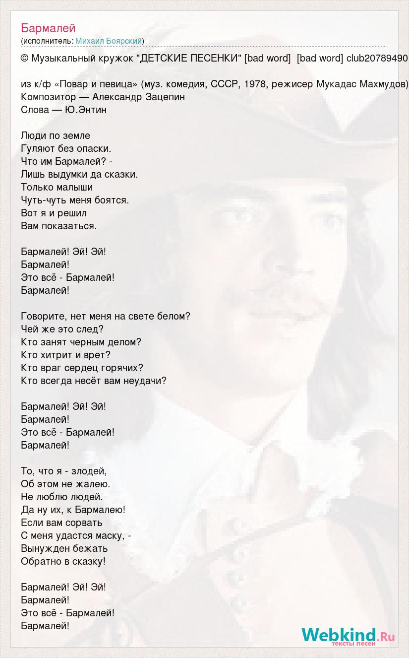 © Музыкальный кружок "ДЕТСКИЕ ПЕСЕНКИ" [bad word] [bad word] club20789490 из к/ф «Повар и певица» (муз. комедия, СССР, 1978, режисер Мукадас Махмудов) Композитор — Александр Зацепин Слова — Ю.Энтин Люди по земле Гуляют без опаски. Что им Бармалей? - Лишь выдумки да сказки. Только малыши Чуть-чуть меня боятся. Вот я и решил Вам показаться. Бармалей! Эй! Эй! Бармалей! Это всё - Бармалей! Бармалей! Говорите, нет меня на свете белом? Чей же это след? Кто занят черным делом? Кто хитрит и врет? Кто враг сердец горячих? Кто всегда несёт вам неудачи? Бармалей! Эй! Эй! Бармалей! Это всё - Бармалей! Бармалей! То, что я - злодей, Об этом не жалею. Не люблю людей. Да ну их, к Бармалею! Если вам сорвать С меня удастся маску, - Вынужден бежать Обратно в сказку! Бармалей! Эй! Эй! Бармалей! Это всё - Бармалей! Бармалей!