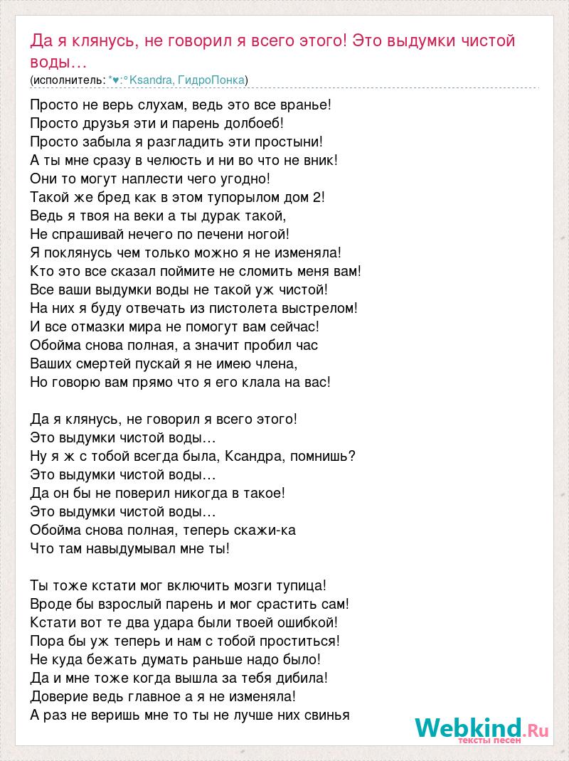 Просто не верь слухам, ведь это все вранье! Просто друзья эти и парень долбоеб! Просто забыла я разгладить эти простыни! А ты мне сразу в челюсть и ни во что не вник! Они то могут наплести чего угодно! Такой же бред как в этом тупорылом дом 2! Ведь я твоя на веки а ты дурак такой, Не спрашивай нечего по печени ногой! Я поклянусь чем только можно я не изменяла! Кто это все сказал поймите не сломить меня вам! Все ваши выдумки воды не такой уж чистой! На них я буду отвечать из пистолета выстрелом! И все отмазки мира не помогут вам сейчас! Обойма снова полная, а значит пробил час Ваших смертей пускай я не имею члена, Но говорю вам прямо что я его клала на вас! Да я клянусь, не говорил я всего этого! Это выдумки чистой воды… Ну я ж с тобой всегда была, Ксандра, помнишь? Это выдумки чистой воды… Да он бы не поверил никогда в такое! Это выдумки чистой воды… Обойма снова полная, теперь скажи-ка Что там навыдумывал мне ты! Ты тоже кстати мог включить мозги тупица! Вроде бы взрослый парень и мог срастить сам! Кстати вот те два удара были твоей ошибкой! Пора бы уж теперь и нам с тобой проститься! Не куда бежать думать раньше надо было! Да и мне тоже когда вышла за тебя дибила! Доверие ведь главное а я не изменяла! А раз не веришь мне то ты не лучше них свинья