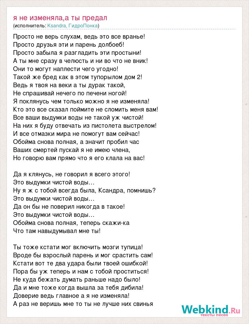 Просто не верь слухам, ведь это все вранье! Просто друзья эти и парень долбоеб! Просто забыла я разгладить эти простыни! А ты мне сразу в челюсть и ни во что не вник! Они то могут наплести чего угодно! Такой же бред как в этом тупорылом дом 2! Ведь я твоя на веки а ты дурак такой, Не спрашивай нечего по печени ногой! Я поклянусь чем только можно я не изменяла! Кто это все сказал поймите не сломить меня вам! Все ваши выдумки воды не такой уж чистой! На них я буду отвечать из пистолета выстрелом! И все отмазки мира не помогут вам сейчас! Обойма снова полная, а значит пробил час Ваших смертей пускай я не имею члена, Но говорю вам прямо что я его клала на вас! Да я клянусь, не говорил я всего этого! Это выдумки чистой воды… Ну я ж с тобой всегда была, Ксандра, помнишь? Это выдумки чистой воды… Да он бы не поверил никогда в такое! Это выдумки чистой воды… Обойма снова полная, теперь скажи-ка Что там навыдумывал мне ты! Ты тоже кстати мог включить мозги тупица! Вроде бы взрослый парень и мог срастить сам! Кстати вот те два удара были твоей ошибкой! Пора бы уж теперь и нам с тобой проститься! Не куда бежать думать раньше надо было! Да и мне тоже когда вышла за тебя дибила! Доверие ведь главное а я не изменяла! А раз не веришь мне то ты не лучше них свинья