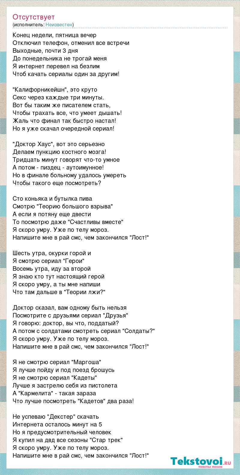 Конец недели, пятница вечер Отключил телефон, отменил все встречи Выходные, почти 3 дня До понедельника не трогай меня Я интернет перевел на безлим Чтоб качать сериалы один за другим! "Калифорникейшн", это круто Секс через каждые три минуты. Вот бы таким же писателем стать, Чтобы трахать все, что умеет дышать! Жаль что финал так быстро настал! Но я уже скачал очередной сериал! "Доктор Хаус", вот это серьезно Делаем пункцию костного мозга! Тридцать минут говорят что-то умное А потом - пиздец - аутоимунное! Но в финале больному удалось умереть Чтобы такого еще посмотреть? Сто коньяка и бутылка пива Смотрю "Теорию большого взрыва" А если я потяну еще двести То посмотрю даже "Счастливы вместе" Я скоро умру. Уже по телу мороз. Напишите мне в рай смс, чем закончился "Лост!" Шесть утра, окурки горой и Я смотрю сериал "Герои" Восемь утра, иду за второй Я знаю кто тут настоящий герой Я скоро умру, а ты мне напиши Что там дальше в "Теории лжи?" Доктор сказал, вам одному быть нельзя Посмотрите с друзьями сериал "Друзья" Я говорю: доктор, вы что, поддатый? А потом с солдатами смотреть сериал "Солдаты?" Я скоро умру. Уже по телу мороз. Напишите мне в рай смс, чем закончился "Лост!" Я не смотрю сериал "Маргоша" Я лучше пойду и под поезд брошусь Я не смотрю сериал "Кадеты" Лучше я застрелю себя из пистолета А "Кармелита" - такая зараза Что лучше посмотреть "Кадетов" два раза! Не успеваю "Декстер" скачать Интернета осталось минут на 5 Но я предусмотрительный человек Я купил на двд все сезоны "Стар трек" Я скоро умру. Уже по телу мороз. Напишите мне в рай смс, чем закончился "Лост!"