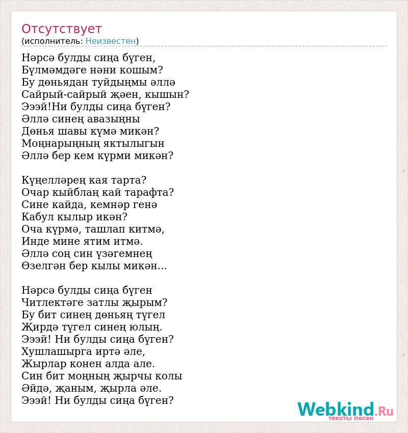Нәрсә булды сиңа бүген, Бүлмәмдәге нәни кошым? Бу дөньядан туйдыңмы әллә Сайрый-сайрый җәен, кышын? Эээй!Ни булды сиңа бүген? Әллә синең авазыңны Дөнья шавы күмә микән? Моңнарыңның яктылыгын Әллә бер кем күрми микән? Күңелләрең кая тарта? Очар кыйблаң кай тарафта? Сине кайда, кемнәр генә Кабул кылыр икән? Оча күрмә, ташлап китмә, Инде мине ятим итмә. Әллә соң син үзәгемнең Өзелгән бер кылы микән... Нәрсә булды сиңа бүген Читлектәге затлы җырым? Бу бит синең дөньяң түгел Җирдә түгел синең юлың. Эээй! Ни булды сиңа бүген? Хушлашырга иртә әле, Жырлар конен алда але. Син бит моңның җырчы колы Әйдә, җаным, җырла әле. Эээй! Ни булды сиңа бүген?