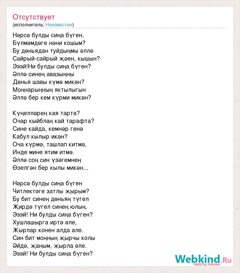 Нәрсә булды сиңа бүген, Бүлмәмдәге нәни кошым? Бу дөньядан туйдыңмы әллә Сайрый-сайрый җәен, кышын? Эээй!Ни булды сиңа бүген? Әллә синең авазыңны Дөнья шавы күмә микән? Моңнарыңның яктылыгын Әллә бер кем күрми микән? Күңелләрең кая тарта? Очар кыйблаң кай тарафта? Сине кайда, кемнәр генә Кабул кылыр икән? Оча күрмә, ташлап китмә, Инде мине ятим итмә. Әллә соң син үзәгемнең Өзелгән бер кылы микән... Нәрсә булды сиңа бүген Читлектәге затлы җырым? Бу бит синең дөньяң түгел Җирдә түгел синең юлың. Эээй! Ни булды сиңа бүген? Хушлашырга иртә әле, Жырлар конен алда але. Син бит моңның җырчы колы Әйдә, җаным, җырла әле. Эээй! Ни булды сиңа бүген?