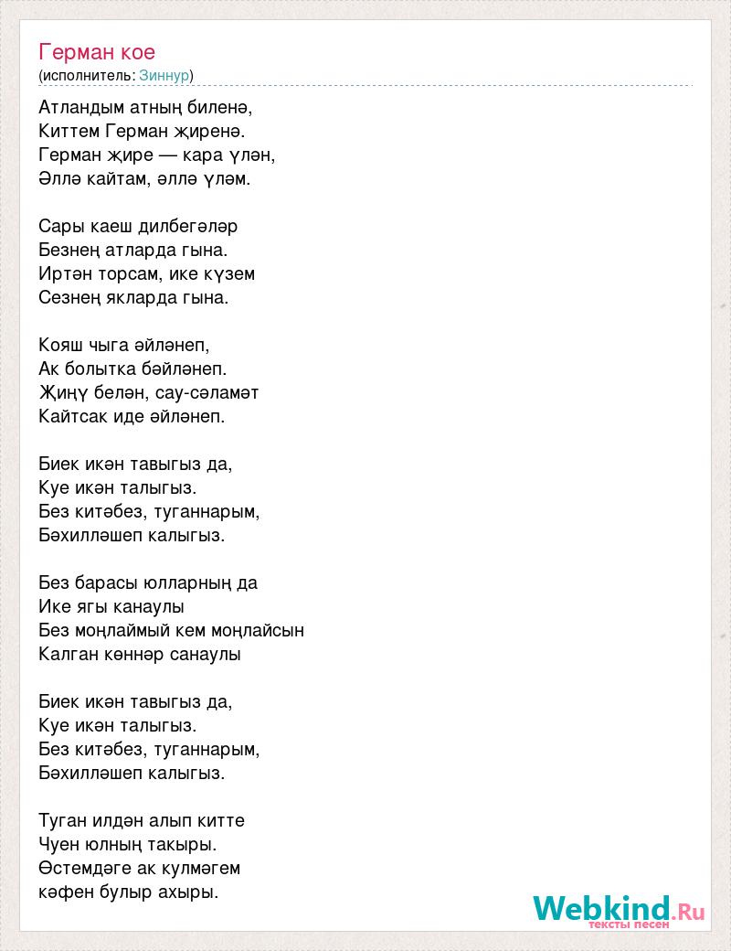 Атландым атның биленә, Киттем Герман җиренә. Герман җире — кара үлән, Әллә кайтам, әллә үләм. Сары каеш дилбегәләр Безнең атларда гына. Иртән торсам, ике күзем Сезнең якларда гына. Кояш чыга әйләнеп, Ак болытка бәйләнеп. Җиңү белән, сау-сәламәт Кайтсак иде әйләнеп. Биек икән тавыгыз да, Куе икән талыгыз. Без китәбез, туганнарым, Бәхилләшеп калыгыз. Без барасы юлларның да Ике ягы канаулы Без моңлаймый кем моңлайсын Калган көннәр санаулы Биек икән тавыгыз да, Куе икән талыгыз. Без китәбез, туганнарым, Бәхилләшеп калыгыз. Туган илдән алып китте Чуен юлның такыры. Өстемдәге ак кулмәгем кәфен булыр ахыры.