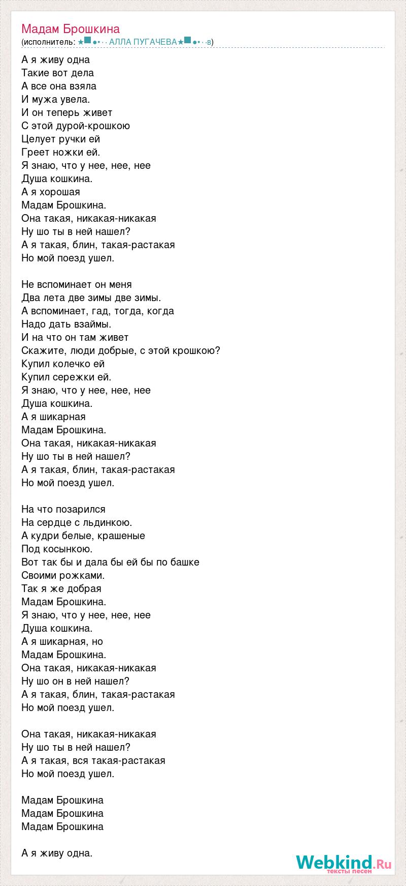 А я живу одна Такие вот дела А все она взяла И мужа увела. И он теперь живет С этой дурой-крошкою Целует ручки ей Греет ножки ей. Я знаю, что у нее, нее, нее Душа кошкина. А я хорошая Мадам Брошкина. Она такая, никакая-никакая Ну шо ты в ней нашел? А я такая, блин, такая-растакая Но мой поезд ушел. Не вспоминает он меня Два лета две зимы две зимы. А вспоминает, гад, тогда, когда Надо дать взаймы. И на что он там живет Скажите, люди добрые, с этой крошкою? Купил колечко ей Купил сережки ей. Я знаю, что у нее, нее, нее Душа кошкина. А я шикарная Мадам Брошкина. Она такая, никакая-никакая Ну шо ты в ней нашел? А я такая, блин, такая-растакая Но мой поезд ушел. На что позарился На сердце с льдинкою. А кудри белые, крашеные Под косынкою. Вот так бы и дала бы ей бы по башке Своими рожками. Так я же добрая Мадам Брошкина. Я знаю, что у нее, нее, нее Душа кошкина. А я шикарная, но Мадам Брошкина. Она такая, никакая-никакая Ну шо он в ней нашел? А я такая, блин, такая-растакая Но мой поезд ушел. Она такая, никакая-никакая Ну шо ты в ней нашел? А я такая, вся такая-растакая Но мой поезд ушел. Мадам Брошкина Мадам Брошкина Мадам Брошкина А я живу одна.