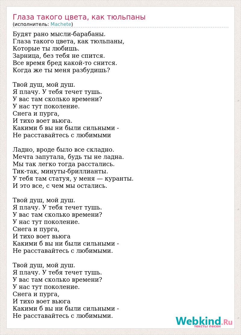 Будят рано мысли-барабаны. Глаза такого цвета, как тюльпаны, Которые ты любишь. Зарница, без тебя не спится. Все время бред какой-то снится. Когда же ты меня разбудишь? Твой душ, мой душ. Я плачу. У тебя течет тушь. У вас там сколько времени? У нас тут поколение. Снега и пурга, И тихо воет вьюга. Какими б вы ни были сильными - Не расставайтесь с любимыми Ладно, вроде было все складно. Мечта запутала, будь ты не ладна. Мы так легко тогда расстались. Тик-так, минуты-бриллианты. У тебя там статуя, у меня — куранты. И это все, с чем мы остались. Твой душ, мой душ. Я плачу. У тебя течет тушь. У вас там сколько времени? У нас тут поколение. Снега и пурга, И тихо воет вьюга Какими б вы ни были сильными - Не расставайтесь с любимыми. Твой душ, мой душ. Я плачу. У тебя течет тушь. У вас там сколько времени? У нас тут поколение. Снега и пурга, И тихо воет вьюга Какими б вы ни были сильными - Не расставайтесь с любимыми.