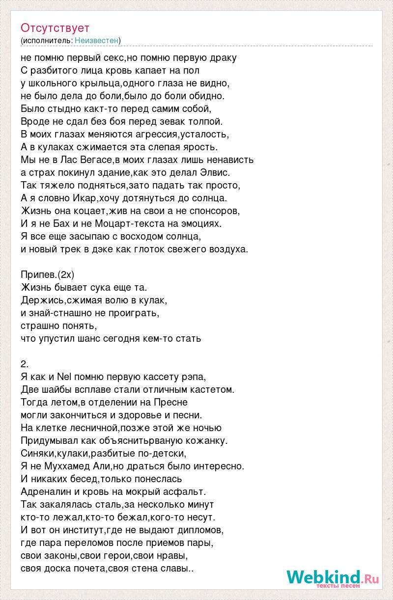 не помню первый секс,но помню первую драку С разбитого лица кровь капает на пол у школьного крыльца,одного глаза не видно, не было дела до боли,было до боли обидно. Было стыдно какт-то перед самим собой, Вроде не сдал без боя перед зевак толпой. В моих глазах меняются агрессия,усталость, А в кулаках сжимается эта слепая ярость. Мы не в Лас Вегасе,в моих глазах лишь ненависть а страх покинул здание,как это делал Элвис. Так тяжело подняться,зато падать так просто, А я словно Икар,хочу дотянуться до солнца. Жизнь она коцает,жив на свои а не спонсоров, И я не Бах и не Моцарт-текста на эмоциях. Я все еще засыпаю с восходом солнца, и новый трек в дэке как глоток свежего воздуха. Припев.(2х) Жизнь бывает сука еще та. Держись,сжимая волю в кулак, и знай-стнашно не проиграть, страшно понять, что упустил шанс сегодня кем-то стать 2. Я как и Nel помню первую кассету рэпа, Две шайбы всплаве стали отличным кастетом. Тогда летом,в отделении на Пресне могли закончиться и здоровье и песни. На клетке лесничной,позже этой же ночью Придумывал как объяснитьрваную кожанку. Синяки,кулаки,разбитые по-детски, Я не Муххамед Али,но драться было интересно. И никаких бесед,только понеслась Адреналин и кровь на мокрый асфальт. Так закалялась сталь,за несколько минут кто-то лежал,кто-то бежал,кого-то несут. И вот он институт,где не выдают дипломов, где пара переломов после приемов пары, свои законы,свои герои,свои нравы, своя доска почета,своя стена славы..