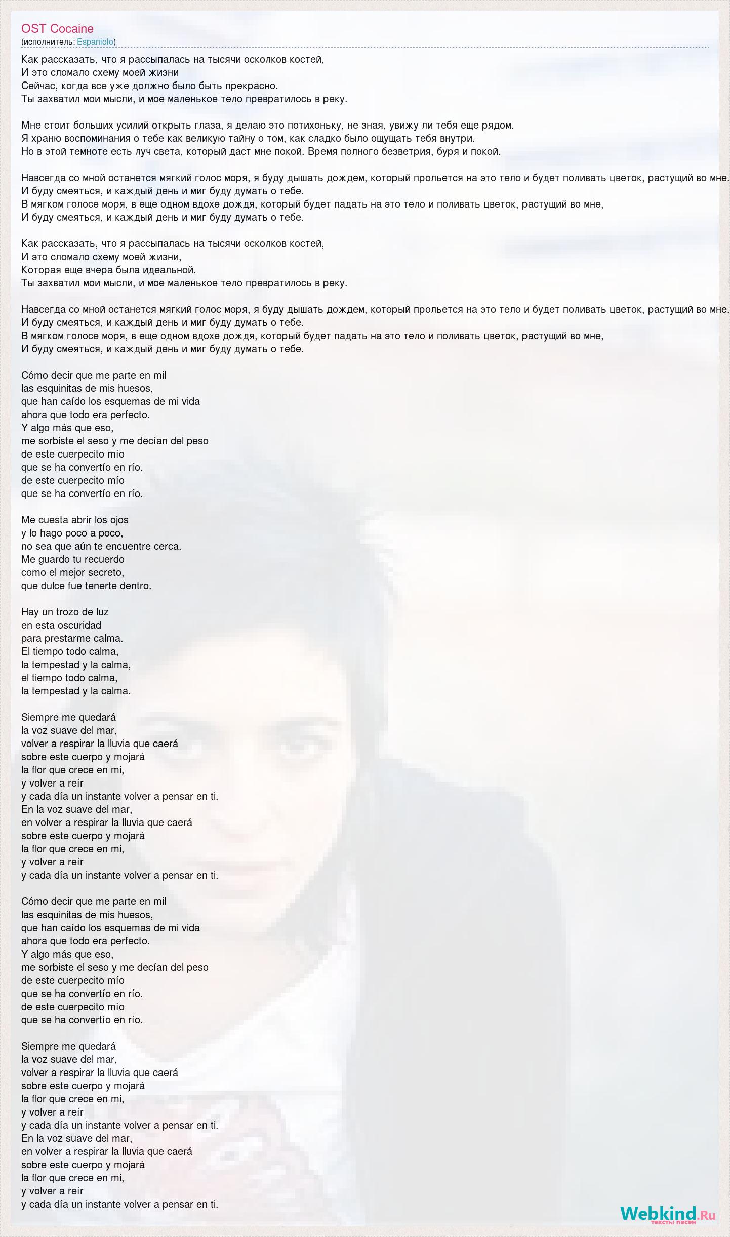 Как рассказать, что я рассыпалась на тысячи осколков костей, И это сломало схему моей жизни Сейчас, когда все уже должно было быть прекрасно. Ты захватил мои мысли, и мое маленькое тело превратилось в реку. Мне стоит больших усилий открыть глаза, я делаю это потихоньку, не зная, увижу ли тебя еще рядом. Я храню воспоминания о тебе как великую тайну о том, как сладко было ощущать тебя внутри. Но в этой темноте есть луч света, который даст мне покой. Время полного безветрия, буря и покой. Навсегда со мной останется мягкий голос моря, я буду дышать дождем, который прольется на это тело и будет поливать цветок, растущий во мне. И буду смеяться, и каждый день и миг буду думать о тебе. В мягком голосе моря, в еще одном вдохе дождя, который будет падать на это тело и поливать цветок, растущий во мне, И буду смеяться, и каждый день и миг буду думать о тебе. Как рассказать, что я рассыпалась на тысячи осколков костей, И это сломало схему моей жизни, Которая еще вчера была идеальной. Ты захватил мои мысли, и мое маленькое тело превратилось в реку. Навсегда со мной останется мягкий голос моря, я буду дышать дождем, который прольется на это тело и будет поливать цветок, растущий во мне. И буду смеяться, и каждый день и миг буду думать о тебе. В мягком голосе моря, в еще одном вдохе дождя, который будет падать на это тело и поливать цветок, растущий во мне, И буду смеяться, и каждый день и миг буду думать о тебе. Cómo decir que me parte en mil las esquinitas de mis huesos, que han caído los esquemas de mi vida ahora que todo era perfecto. Y algo más que eso, me sorbiste el seso y me decían del peso de este cuerpecito mío que se ha convertío en río. de este cuerpecito mío que se ha convertío en río. Me cuesta abrir los ojos y lo hago poco a poco, no sea que aún te encuentre cerca. Me guardo tu recuerdo como el mejor secreto, que dulce fue tenerte dentro. Hay un trozo de luz en esta oscuridad para prestarme calma. El tiempo todo calma, la tempestad y la calma, el tiempo todo calma, la tempestad y la calma. Siempre me quedará la voz suave del mar, volver a respirar la lluvia que caerá sobre este cuerpo y mojará la flor que crece en mi, y volver a reír y cada día un instante volver a pensar en ti. En la voz suave del mar, en volver a respirar la lluvia que caerá sobre este cuerpo y mojará la flor que crece en mi, y volver a reír y cada día un instante volver a pensar en ti. Cómo decir que me parte en mil las esquinitas de mis huesos, que han caído los esquemas de mi vida ahora que todo era perfecto. Y algo más que eso, me sorbiste el seso y me decían del peso de este cuerpecito mío que se ha convertío en río. de este cuerpecito mío que se ha convertío en río. Siempre me quedará la voz suave del mar, volver a respirar la lluvia que caerá sobre este cuerpo y mojará la flor que crece en mi, y volver a reír y cada día un instante volver a pensar en ti. En la voz suave del mar, en volver a respirar la lluvia que caerá sobre este cuerpo y mojará la flor que crece en mi, y volver a reír y cada día un instante volver a pensar en ti.