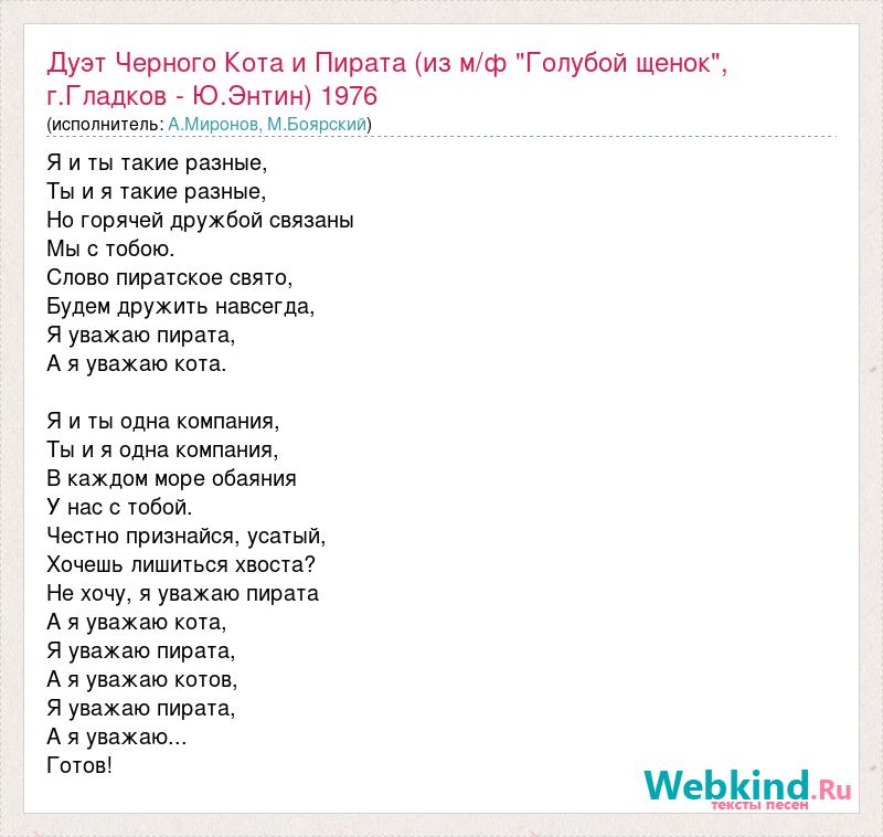 Я и ты такие разные, Ты и я такие разные, Но горячей дружбой связаны Мы с тобою. Слово пиратское свято, Будем дружить навсегда, Я уважаю пирата, А я уважаю кота. Я и ты одна компания, Ты и я одна компания, В каждом море обаяния У нас с тобой. Честно признайся, усатый, Хочешь лишиться хвоста? Не хочу, я уважаю пирата А я уважаю кота, Я уважаю пирата, А я уважаю котов, Я уважаю пирата, А я уважаю... Готов!