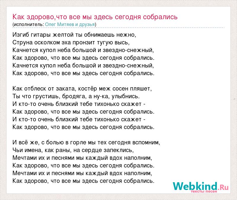Изгиб гитары желтой ты обнимаешь нежно, Струна осколком эха пронзит тугую высь, Качнется купол неба большой и звездно-снежный, Как здорово, что все мы здесь сегодня собрались. Качнется купол неба большой и звездно-снежный, Как здорово, что все мы здесь сегодня собрались. Как отблеск от заката, костёр меж сосен пляшет, Ты что грустишь, бродяга, а ну-ка, улыбнись. И кто-то очень близкий тебе тихонько скажет - Как здорово, что все мы здесь сегодня собрались. И кто-то очень близкий тебе тихонько скажет - Как здорово, что все мы здесь сегодня собрались. И всё же, с болью в горле мы тех сегодня вспомним, Чьи имена, как раны, на сердце запеклись, Мечтами их и песнями мы каждый вдох наполним, Как здорово, что все мы здесь сегодня собрались. Мечтами их и песнями мы каждый вдох наполним, Как здорово, что все мы здесь сегодня собрались.