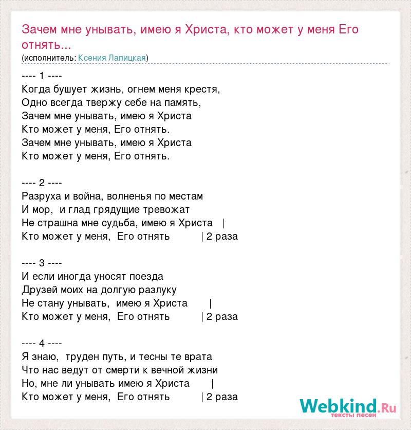 ---- 1 ---- Когда бушует жизнь, огнем меня крестя, Одно всегда твержу себе на память, Зачем мне унывать, имею я Христа Кто может у меня, Его отнять. Зачем мне унывать, имею я Христа Кто может у меня, Его отнять. ---- 2 ---- Разруха и война, волненья по местам И мор, и глад грядущие тревожат Не страшна мне судьба, имею я Христа | Кто может у меня, Его отнять | 2 раза ---- 3 ---- И если иногда уносят поезда Друзей моих на долгую разлуку Не стану унывать, имею я Христа | Кто может у меня, Его отнять | 2 раза ---- 4 ---- Я знаю, труден путь, и тесны те врата Что нас ведут от смерти к вечной жизни Но, мне ли унывать имею я Христа | Кто может у меня, Его отнять | 2 раза