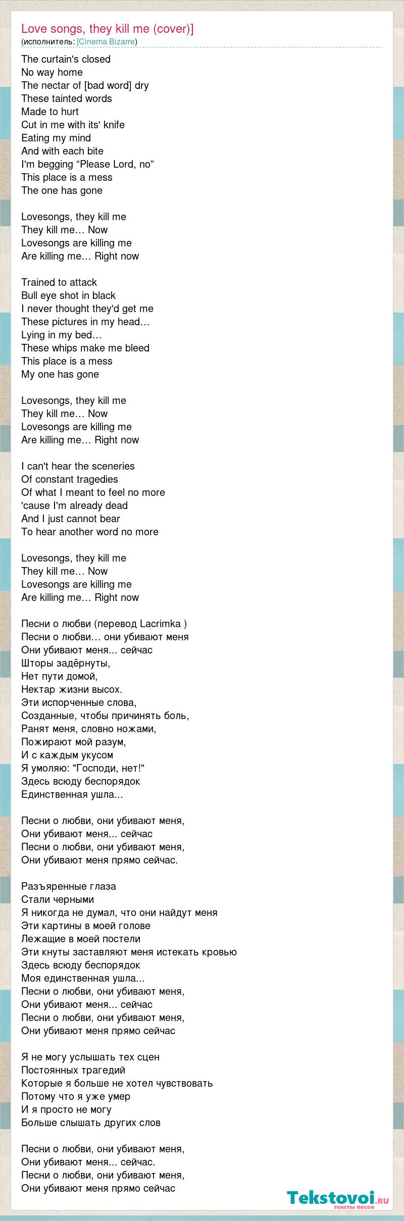 The curtain's closed No way home The nectar of life run dry These tainted words Made to hurt Cut in me with its' knife Eating my mind And with each bite I'm begging “Please Lord, no” This place is a mess The one has gone Lovesongs, they kill me They kill me… Now Lovesongs are killing me Are killing me… Right now Trained to attack Bull eye shot in black I never thought they'd get me These pictures in my head… Lying in my bed… These whips make me bleed This place is a mess My one has gone Lovesongs, they kill me They kill me… Now Lovesongs are killing me Are killing me… Right now I can't hear the sceneries Of constant tragedies Of what I meant to feel no more 'cause I'm already dead And I just cannot bear To hear another word no more Lovesongs, they kill me They kill me… Now Lovesongs are killing me Are killing me… Right now Песни о любви (перевод Lacrimka ) Песни о любви… они убивают меня Они убивают меня... сейчас Шторы задёрнуты, Нет пути домой, Нектар жизни высох. Эти испорченные слова, Созданные, чтобы причинять боль, Ранят меня, словно ножами, Пожирают мой разум, И с каждым укусом Я умоляю: "Господи, нет!" Здесь всюду беспорядок Единственная ушла... Песни о любви, они убивают меня, Они убивают меня... сейчас Песни о любви, они убивают меня, Они убивают меня прямо сейчас. Разъяренные глаза Стали черными Я никогда не думал, что они найдут меня Эти картины в моей голове Лежащие в моей постели Эти кнуты заставляют меня истекать кровью Здесь всюду беспорядок Моя единственная ушла... Песни о любви, они убивают меня, Они убивают меня... сейчас Песни о любви, они убивают меня, Они убивают меня прямо сейчас Я не могу услышать тех сцен Постоянных трагедий Которые я больше не хотел чувствовать Потому что я уже умер И я просто не могу Больше слышать других слов Песни о любви, они убивают меня, Они убивают меня... сейчас. Песни о любви, они убивают меня, Они убивают меня прямо сейчас