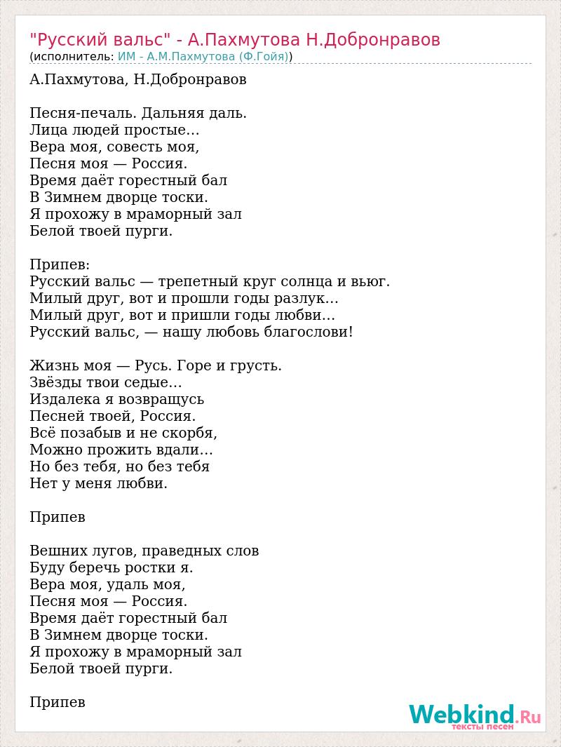 А.Пахмутова, Н.Добронравов Песня-печаль. Дальняя даль. Лица людей простые… Вера моя, совесть моя, Песня моя — Россия. Время даёт горестный бал В Зимнем дворце тоски. Я прохожу в мраморный зал Белой твоей пурги. Припев: Русский вальс — трепетный круг солнца и вьюг. Милый друг, вот и прошли годы разлук… Милый друг, вот и пришли годы любви… Русский вальс, — нашу любовь благослови! Жизнь моя — Русь. Горе и грусть. Звёзды твои седые… Издалека я возвращусь Песней твоей, Россия. Всё позабыв и не скорбя, Можно прожить вдали… Но без тебя, но без тебя Нет у меня любви. Припев Вешних лугов, праведных слов Буду беречь ростки я. Вера моя, удаль моя, Песня моя — Россия. Время даёт горестный бал В Зимнем дворце тоски. Я прохожу в мраморный зал Белой твоей пурги. Припев