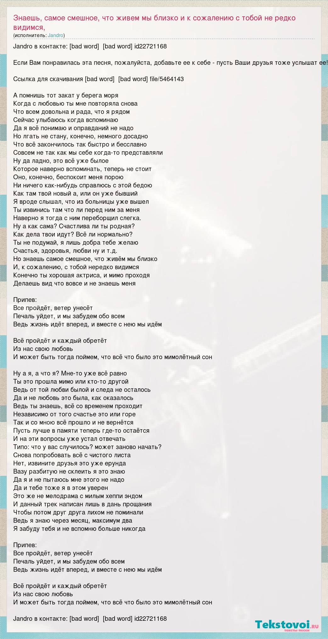 Jandro в контакте: [bad word] [bad word] id22721168 Если Вам понравилась эта песня, пожалуйста, добавьте ее к себе - пусть Ваши друзья тоже услышат ее! Ссылка для скачивания [bad word] [bad word] file/5464143 А помнишь тот закат у берега моря Когда с любовью ты мне повторяла снова Что всем довольна и рада, что я рядом Сейчас улыбаюсь когда вспоминаю Да я всё понимаю и оправданий не надо Но лгать не стану, конечно, немного досадно Что всё закончилось так быстро и бесславно Совсем не так как мы себе когда-то представляли Ну да ладно, это всё уже былое Которое наверно вспоминать, теперь не стоит Оно, конечно, беспокоит меня порою Ни ничего как-нибудь справлюсь с этой бедою Как там твой новый а, или он уже бывший Я вроде слышал, что из больницы уже вышел Ты извинись там что ли перед ним за меня Наверно я тогда с ним переборщил слегка. Ну а как сама? Счастлива ли ты родная? Как дела твои идут? Всё ли нормально? Ты не подумай, я лишь добра тебе желаю Счастья, здоровья, любви ну и т.д. Но знаешь самое смешное, что живём мы близко И, к сожалению, с тобой нередко видимся Конечно ты хорошая актриса, и мимо проходя Делаешь вид что вовсе и не знаешь меня Припев: Все пройдёт, ветер унесёт Печаль уйдет, и мы забудем обо всем Ведь жизнь идёт вперед, и вместе с нею мы идём Всё пройдёт и каждый обретёт Из нас свою любовь И может быть тогда поймем, что всё что было это мимолётный сон Ну а я, а что я? Мне-то уже всё равно Ты это прошла мимо или кто-то другой Ведь от той любви былой и следа не осталось Да и не любовь это была, как оказалось Ведь ты знаешь, всё со временем проходит Независимо от того счастье это или горе Так и со мною всё прошло и не вернётся Пусть лучше в памяти теперь где-то остаётся И на эти вопросы уже устал отвечать Типо: что у вас случилось? может заново начать? Снова попробовать всё с чистого листа Нет, извините друзья это уже ерунда Вазу разбитую не склеить я это знаю Да я и не пытаюсь мне этого не надо Да и тебе тоже я в этом уверен Это же не мелодрама с милым хеппи эндом И данный трек написан лишь в дань прощания Чтобы потом друг друга лихом не поминали Ведь я знаю через месяц, максимум два Я забуду тебя и не вспомню больше никогда Припев: Все пройдёт, ветер унесёт Печаль уйдет, и мы забудем обо всем Ведь жизнь идёт вперед, и вместе с нею мы идём Всё пройдёт и каждый обретёт Из нас свою любовь И может быть тогда поймем, что всё что было это мимолётный сон Jandro в контакте: [bad word] [bad word] id22721168