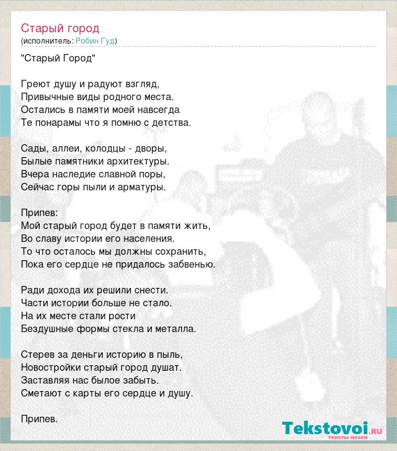"Старый Город" Греют душу и радуют взгляд, Привычные виды родного места. Остались в памяти моей навсегда Те понарамы что я помню с детства. Сады, аллеи, колодцы - дворы, Былые памятники архитектуры. Вчера наследие славной поры, Сейчас горы пыли и арматуры. Припев: Мой старый город будет в памяти жить, Во славу истории его населения. То что осталось мы должны сохранить, Пока его сердце не придалось забвенью. Ради дохода их решили снести. Части истории больше не стало. На их месте стали рости Бездушные формы стекла и металла. Стерев за деньги историю в пыль, Новостройки старый город душат. Заставляя нас былое забыть. Сметают с карты его сердце и душу. Припев.