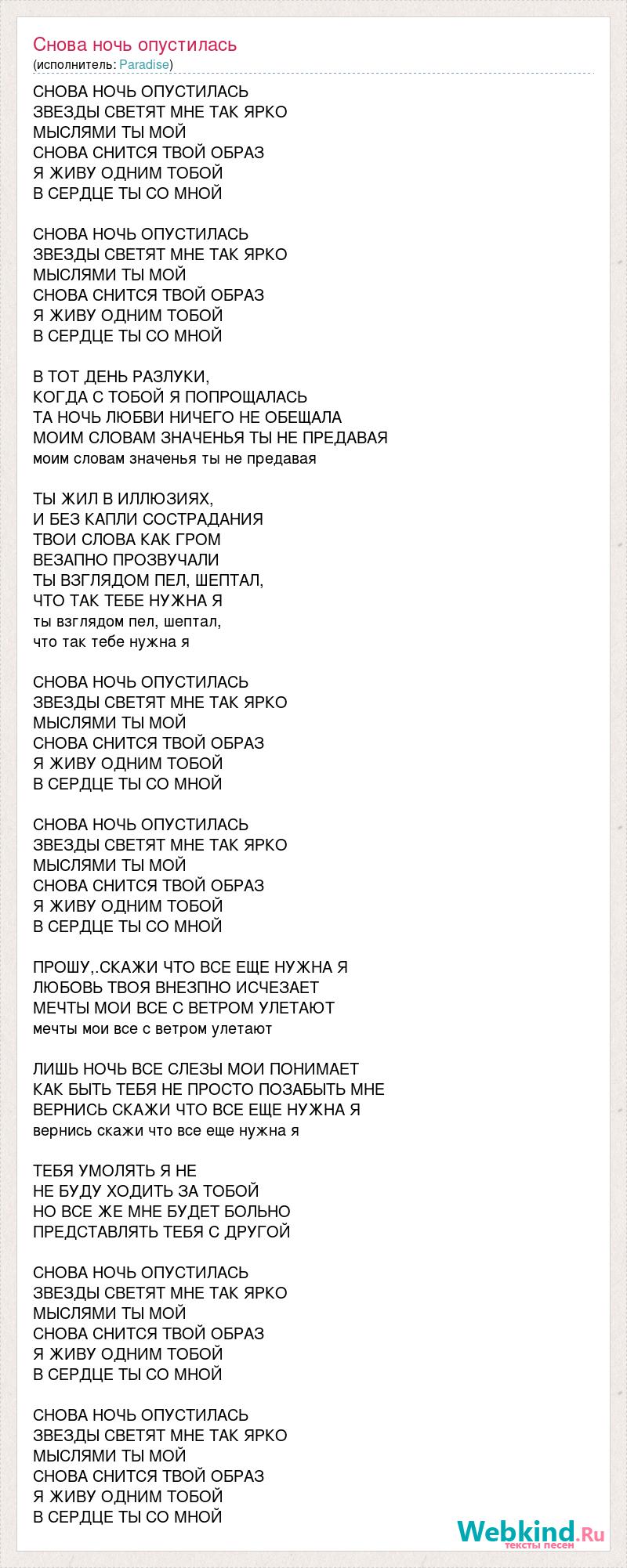 СНОВА НОЧЬ ОПУСТИЛАСЬ ЗВЕЗДЫ СВЕТЯТ МНЕ ТАК ЯРКО МЫСЛЯМИ ТЫ МОЙ СНОВА СНИТСЯ ТВОЙ ОБРАЗ Я ЖИВУ ОДНИМ ТОБОЙ В СЕРДЦЕ ТЫ СО МНОЙ СНОВА НОЧЬ ОПУСТИЛАСЬ ЗВЕЗДЫ СВЕТЯТ МНЕ ТАК ЯРКО МЫСЛЯМИ ТЫ МОЙ СНОВА СНИТСЯ ТВОЙ ОБРАЗ Я ЖИВУ ОДНИМ ТОБОЙ В СЕРДЦЕ ТЫ СО МНОЙ В ТОТ ДЕНЬ РАЗЛУКИ, КОГДА С ТОБОЙ Я ПОПРОЩАЛАСЬ ТА НОЧЬ ЛЮБВИ НИЧЕГО НЕ ОБЕЩАЛА МОИМ СЛОВАМ ЗНАЧЕНЬЯ ТЫ НЕ ПРЕДАВАЯ моим словам значенья ты не предавая ТЫ ЖИЛ В ИЛЛЮЗИЯХ, И БЕЗ КАПЛИ СОСТРАДАНИЯ ТВОИ СЛОВА КАК ГРОМ ВЕЗАПНО ПРОЗВУЧАЛИ ТЫ ВЗГЛЯДОМ ПЕЛ, ШЕПТАЛ, ЧТО ТАК ТЕБЕ НУЖНА Я ты взглядом пел, шептал, что так тебе нужна я СНОВА НОЧЬ ОПУСТИЛАСЬ ЗВЕЗДЫ СВЕТЯТ МНЕ ТАК ЯРКО МЫСЛЯМИ ТЫ МОЙ СНОВА СНИТСЯ ТВОЙ ОБРАЗ Я ЖИВУ ОДНИМ ТОБОЙ В СЕРДЦЕ ТЫ СО МНОЙ СНОВА НОЧЬ ОПУСТИЛАСЬ ЗВЕЗДЫ СВЕТЯТ МНЕ ТАК ЯРКО МЫСЛЯМИ ТЫ МОЙ СНОВА СНИТСЯ ТВОЙ ОБРАЗ Я ЖИВУ ОДНИМ ТОБОЙ В СЕРДЦЕ ТЫ СО МНОЙ ПРОШУ,.СКАЖИ ЧТО ВСЕ ЕЩЕ НУЖНА Я ЛЮБОВЬ ТВОЯ ВНЕЗПНО ИСЧЕЗАЕТ МЕЧТЫ МОИ ВСЕ С ВЕТРОМ УЛЕТАЮТ мечты мои все с ветром улетают ЛИШЬ НОЧЬ ВСЕ СЛЕЗЫ МОИ ПОНИМАЕТ КАК БЫТЬ ТЕБЯ НЕ ПРОСТО ПОЗАБЫТЬ МНЕ ВЕРНИСЬ СКАЖИ ЧТО ВСЕ ЕЩЕ НУЖНА Я вернись скажи что все еще нужна я ТЕБЯ УМОЛЯТЬ Я НЕ НЕ БУДУ ХОДИТЬ ЗА ТОБОЙ НО ВСЕ ЖЕ МНЕ БУДЕТ БОЛЬНО ПРЕДСТАВЛЯТЬ ТЕБЯ С ДРУГОЙ СНОВА НОЧЬ ОПУСТИЛАСЬ ЗВЕЗДЫ СВЕТЯТ МНЕ ТАК ЯРКО МЫСЛЯМИ ТЫ МОЙ СНОВА СНИТСЯ ТВОЙ ОБРАЗ Я ЖИВУ ОДНИМ ТОБОЙ В СЕРДЦЕ ТЫ СО МНОЙ СНОВА НОЧЬ ОПУСТИЛАСЬ ЗВЕЗДЫ СВЕТЯТ МНЕ ТАК ЯРКО МЫСЛЯМИ ТЫ МОЙ СНОВА СНИТСЯ ТВОЙ ОБРАЗ Я ЖИВУ ОДНИМ ТОБОЙ В СЕРДЦЕ ТЫ СО МНОЙ