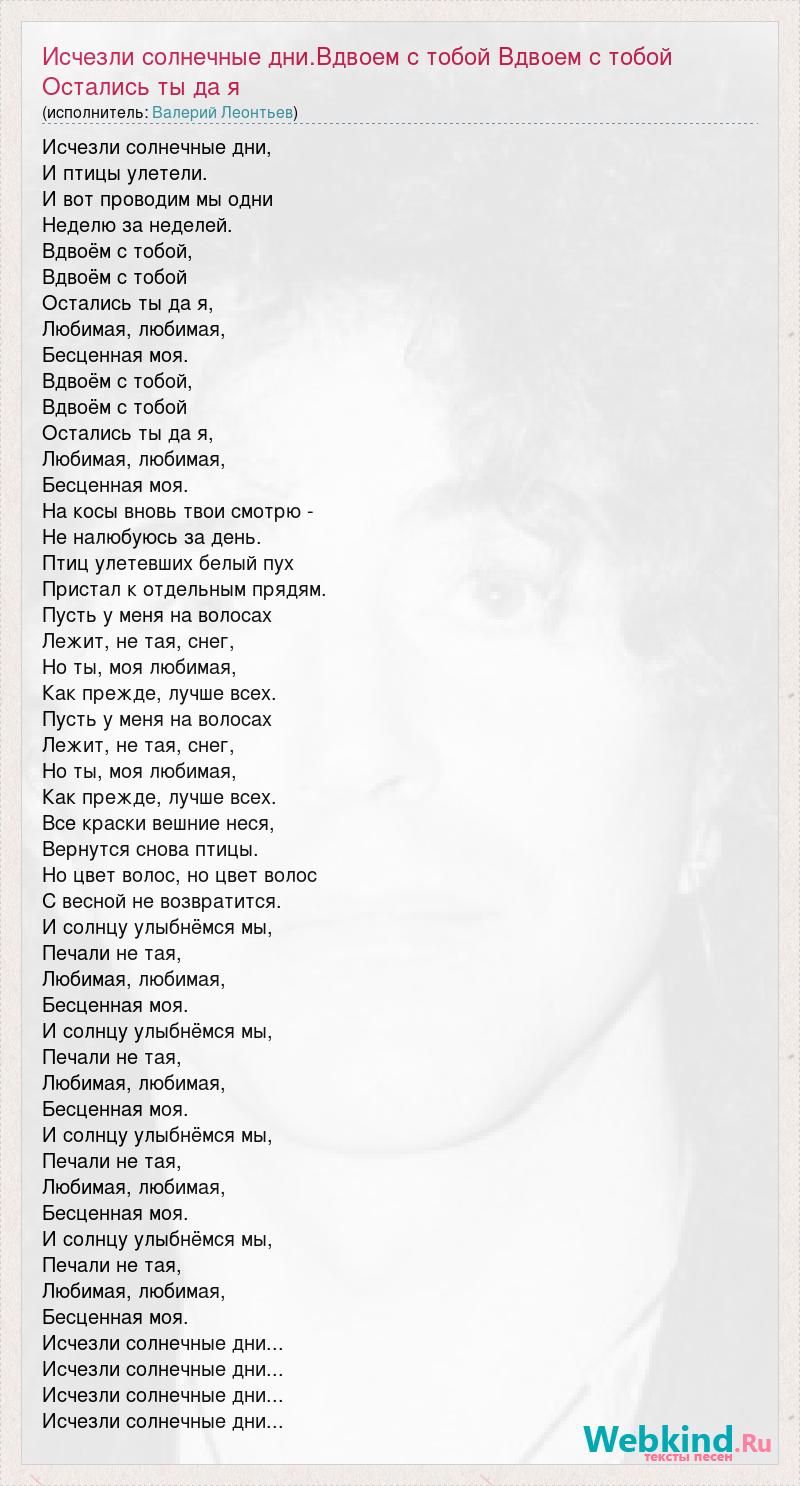 Исчезли солнечные дни, И птицы улетели. И вот проводим мы одни Неделю за неделей. Вдвоём с тобой, Вдвоём с тобой Остались ты да я, Любимая, любимая, Бесценная моя. Вдвоём с тобой, Вдвоём с тобой Остались ты да я, Любимая, любимая, Бесценная моя. На косы вновь твои смотрю - Не налюбуюсь за день. Птиц улетевших белый пух Пристал к отдельным прядям. Пусть у меня на волосах Лежит, не тая, снег, Но ты, моя любимая, Как прежде, лучше всех. Пусть у меня на волосах Лежит, не тая, снег, Но ты, моя любимая, Как прежде, лучше всех. Все краски вешние неся, Вернутся снова птицы. Но цвет волос, но цвет волос С весной не возвратится. И солнцу улыбнёмся мы, Печали не тая, Любимая, любимая, Бесценная моя. И солнцу улыбнёмся мы, Печали не тая, Любимая, любимая, Бесценная моя. И солнцу улыбнёмся мы, Печали не тая, Любимая, любимая, Бесценная моя. И солнцу улыбнёмся мы, Печали не тая, Любимая, любимая, Бесценная моя. Исчезли солнечные дни... Исчезли солнечные дни... Исчезли солнечные дни... Исчезли солнечные дни...