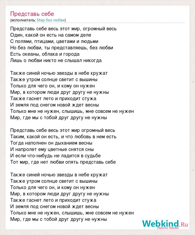 Представь себе весь этот мир, огромный весь Один, какой он есть на самом деле С полями, птицами, цветами и людьми Но без любви, ты представляешь, без любви Есть океаны, облака и города Лишь о любви никто не слышал никогда Также синей ночью звезды в небе кружат Также утром солнце светит с вышины Только для чего он, и кому он нужен Мир, в котором люди друг другу не нужны Также гаснет лето и приходит стужа И земля под снегом новой ждет весны Только мне не нужен, слышишь, мне совсем не нужен Мир, где мы с тобой друг другу не нужны Представь себе весь этот мир огромный весь Таким, какой он есть, и что любовь в нем есть Тогда наполнен он дыханием весны И напролет ему цветные снятся сны И если что-нибудь не ладится в судьбе Тот мир, где нет любви опять представь себе Также синей ночью звезды в небе кружат Также утром солнце светит с вышины Только для чего он, и кому он нужен Мир, в котором люди друг другу не нужны Также гаснет лето и приходит стужа И земля под снегом новой ждет весны Только мне не нужен, слышишь, мне совсем не нужен Мир, где мы с тобой друг другу не нужны