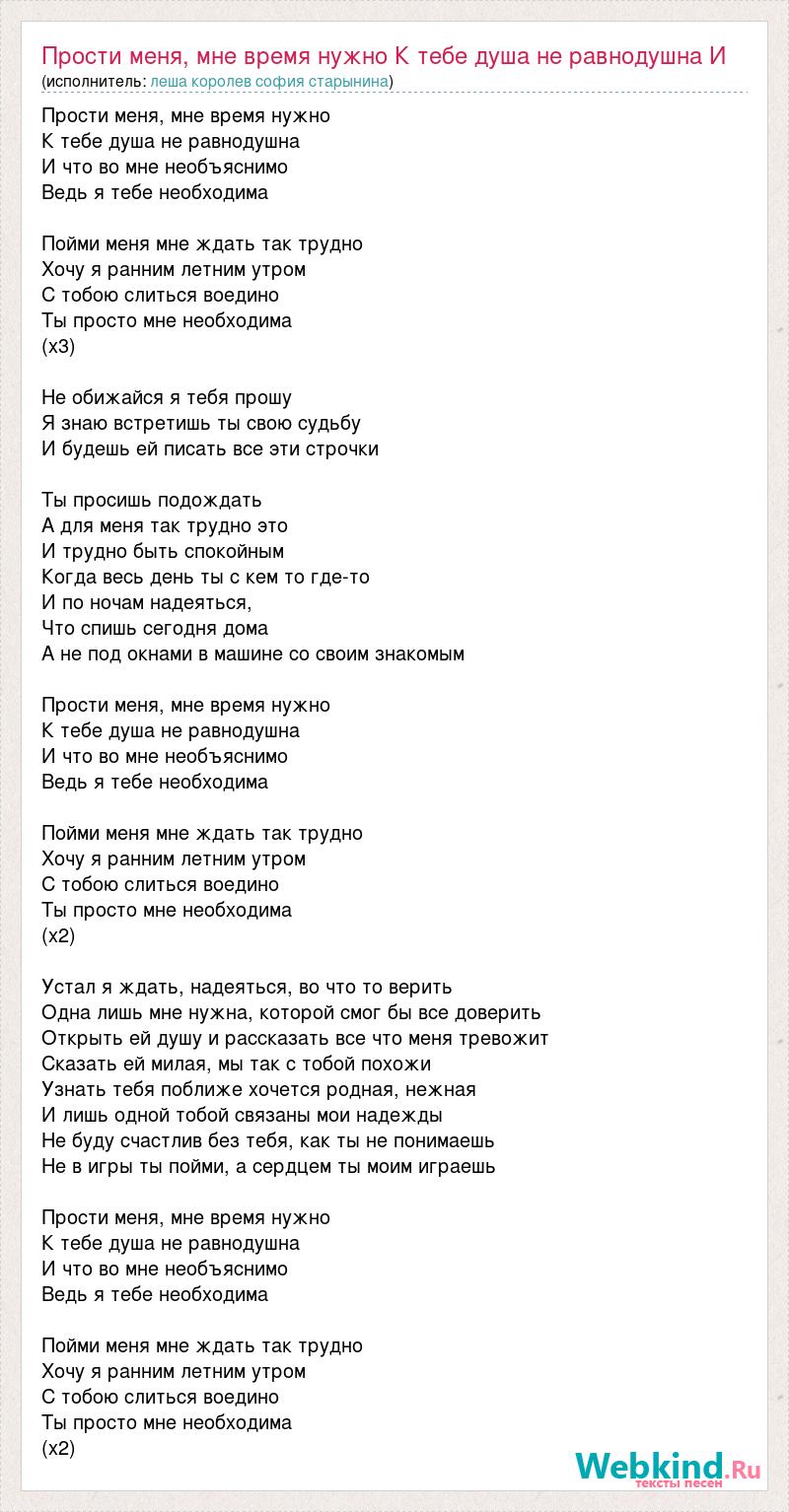 Прости меня, мне время нужно К тебе душа не равнодушна И что во мне необъяснимо Ведь я тебе необходима Пойми меня мне ждать так трудно Хочу я ранним летним утром С тобою слиться воедино Ты просто мне необходима (х3) Не обижайся я тебя прошу Я знаю встретишь ты свою судьбу И будешь ей писать все эти строчки Ты просишь подождать А для меня так трудно это И трудно быть спокойным Когда весь день ты с кем то где-то И по ночам надеяться, Что спишь сегодня дома А не под окнами в машине со своим знакомым Прости меня, мне время нужно К тебе душа не равнодушна И что во мне необъяснимо Ведь я тебе необходима Пойми меня мне ждать так трудно Хочу я ранним летним утром С тобою слиться воедино Ты просто мне необходима (х2) Устал я ждать, надеяться, во что то верить Одна лишь мне нужна, которой смог бы все доверить Открыть ей душу и рассказать все что меня тревожит Сказать ей милая, мы так с тобой похожи Узнать тебя поближе хочется родная, нежная И лишь одной тобой связаны мои надежды Не буду счастлив без тебя, как ты не понимаешь Не в игры ты пойми, а сердцем ты моим играешь Прости меня, мне время нужно К тебе душа не равнодушна И что во мне необъяснимо Ведь я тебе необходима Пойми меня мне ждать так трудно Хочу я ранним летним утром С тобою слиться воедино Ты просто мне необходима (х2)