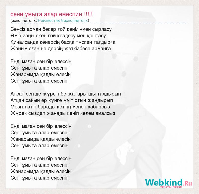 Сенсіз арман бекер ғой көңіліңмен сырласу Өмір заңы екен ғой кездесу мен қоштасу Қиналсаңда көнерсің басқа түскен тағдырға Жаным оған не дерсің жеткізбесе арманға Енді маған сен бір елессің Сені ұмыта алар емеспін Жанарымда қалды елесін Сені ұмыта алар емеспін Аңсап сен де жүрсің бе жанарыңды талдырып Атқан сайын әр күнге үміт отын жандырып Мезгіл өтіп барады кеттің менен хабарсыз Жүрек сыздап жанады көніп келем амалсыз Енді маған сен бір елессің Сені ұмыта алар емеспін Жанарымда қалды елесін Сені ұмыта алар емеспін Енді маған сен бір елессің Сені ұмыта алар емеспін Жанарымда қалды елесін Сені ұмыта алар емеспін