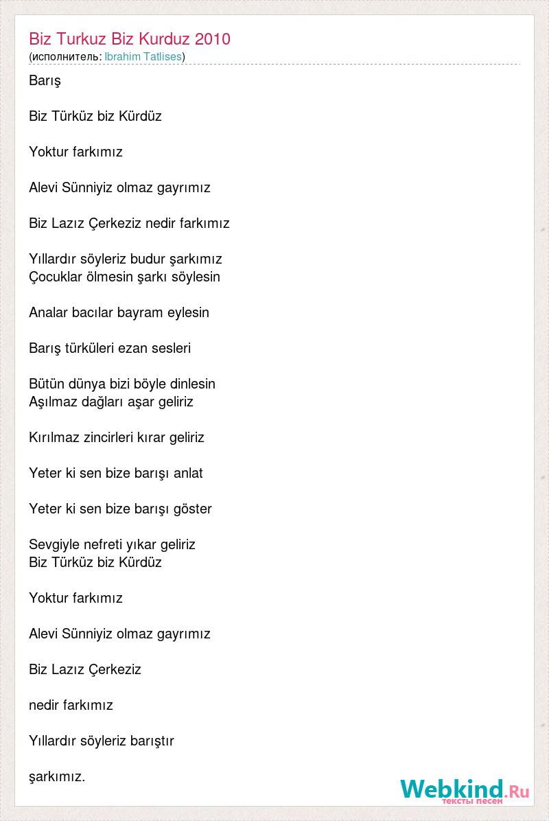 Barış Biz Türküz biz Kürdüz Yoktur farkımız Alevi Sünniyiz olmaz gayrımız Biz Lazız Çerkeziz nedir farkımız Yıllardır söyleriz budur şarkımız Çocuklar ölmesin şarkı söylesin Analar bacılar bayram eylesin Barış türküleri ezan sesleri Bütün dünya bizi böyle dinlesin Aşılmaz dağları aşar geliriz Kırılmaz zincirleri kırar geliriz Yeter ki sen bize barışı anlat Yeter ki sen bize barışı göster Sevgiyle nefreti yıkar geliriz Biz Türküz biz Kürdüz Yoktur farkımız Alevi Sünniyiz olmaz gayrımız Biz Lazız Çerkeziz nedir farkımız Yıllardır söyleriz barıştır şarkımız.