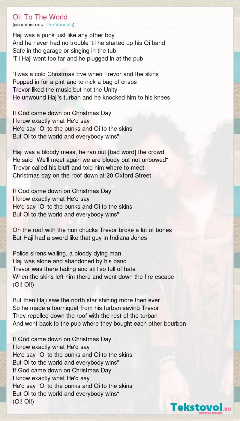 Haji was a punk just like any other boy And he never had no trouble 'til he started up his Oi band Safe in the garage or singing in the tub 'Til Haji went too far and he plugged in at the pub 'Twas a cold Christmas Eve when Trevor and the skins Popped in for a pint and to nick a bag of crisps Trevor liked the music but not the Unity He unwound Haji's turban and he knocked him to his knees If God came down on Christmas Day I know exactly what He'd say He'd say "Oi to the punks and Oi to the skins But Oi to the world and everybody wins" Haji was a bloody mess, he ran out thru the crowd He said "We'll meet again we are bloody but not unbowed" Trevor called his bluff and told him where to meet Christmas day on the roof down at 20 Oxford Street If God came down on Christmas Day I know exactly what He'd say He'd say "Oi to the punks and Oi to the skins But Oi to the world and everybody wins" On the roof with the nun chucks Trevor broke a lot of bones But Haji had a sword like that guy in Indiana Jones Police sirens wailing, a bloody dying man Haji was alone and abandoned by his band Trevor was there fading and still so full of hate When the skins left him there and went down the fire escape (Oi! Oi!) But then Haji saw the north star shining more then ever So he made a tourniquet from his turban saving Trevor They repelled down the roof with the rest of the turban And went back to the pub where they bought each other bourbon If God came down on Christmas Day I know exactly what He'd say He'd say "Oi to the punks and Oi to the skins But Oi to the world and everybody wins" If God came down on Christmas Day I know exactly what He'd say He'd say "Oi to the punks and Oi to the skins But Oi to the world and everybody wins" (Oi! Oi!)