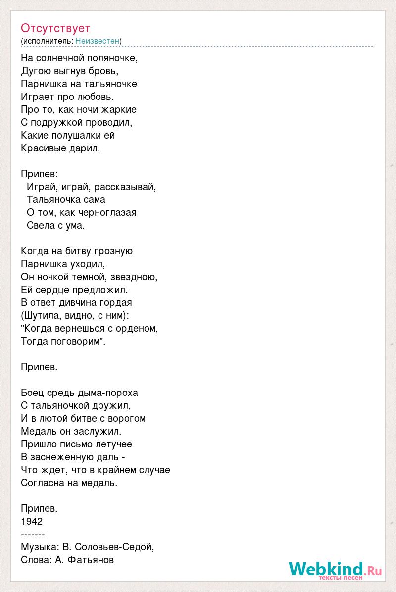 На солнечной поляночке, Дугою выгнув бровь, Парнишка на тальяночке Играет про любовь. Про то, как ночи жаркие С подружкой проводил, Какие полушалки ей Красивые дарил. Припев: Играй, играй, рассказывай, Тальяночка сама О том, как черноглазая Свела с ума. Когда на битву грозную Парнишка уходил, Он ночкой темной, звездною, Ей сердце предложил. В ответ дивчина гордая (Шутила, видно, с ним): "Когда вернешься с орденом, Тогда поговорим". Припев. Боец средь дыма-пороха С тальяночкой дружил, И в лютой битве с ворогом Медаль он заслужил. Пришло письмо летучее В заснеженную даль - Что ждет, что в крайнем случае Согласна на медаль. Припев. 1942 ------- Музыка: В. Соловьев-Седой, Слова: А. Фатьянов