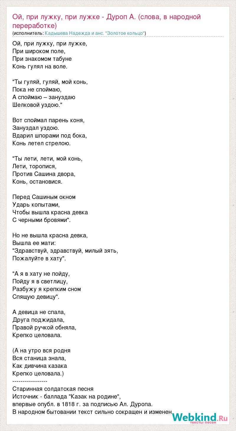 Ой, при лужку, при лужке, При широком поле, При знакомом табуне Конь гулял на воле. "Ты гуляй, гуляй, мой конь, Пока не споймаю, А споймаю – зануздаю Шелковой уздою." Вот споймал парень коня, Зануздал уздою. Вдарил шпорами под бока, Конь летел стрелою. "Ты лети, лети, мой конь, Лети, торопися, Против Сашина двора, Конь, остановися. Перед Сашиным окном Ударь копытами, Чтобы вышла красна девка С черными бровями". Но не вышла красна девка, Вышла ее мати: "Здравствуй, здравствуй, милый зять, Пожалуйте в хату". "А я в хату не пойду, Пойду я в светлицу, Разбужу я крепким сном Спящую девицу". А девица не спала, Друга поджидала, Правой ручкой обняла, Крепко целовала. (А на утро вся родня Вся станица знала, Как дивчина казака Крепко целовала.) ----------------- Старинная солдатская песня Источник - баллада "Казак на родине", впервые опубл. в 1818 г. за подписью Ал. Дуропа. В народном бытовании текст сильно сокращен и изменен.