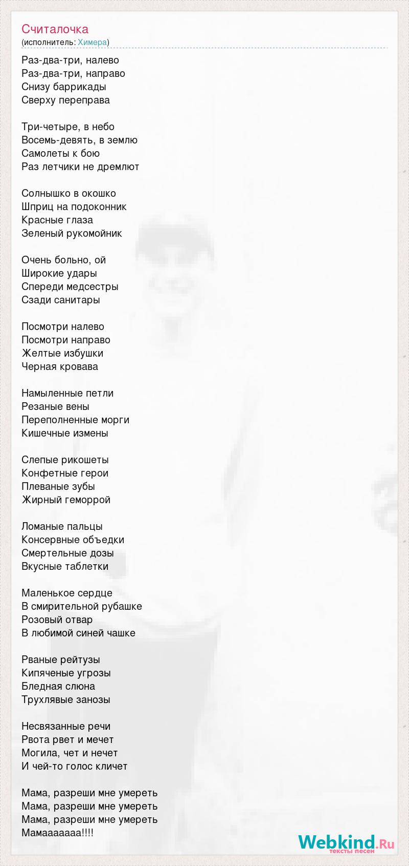 Раз-два-три, налево Раз-два-три, направо Снизу баррикады Сверху переправа Три-четыре, в небо Восемь-девять, в землю Самолеты к бою Раз летчики не дремлют Солнышко в окошко Шприц на подоконник Красные глаза Зеленый рукомойник Очень больно, ой Широкие удары Спереди медсестры Сзади санитары Посмотри налево Посмотри направо Желтые избушки Черная кровава Намыленные петли Резаные вены Переполненные морги Кишечные измены Слепые рикошеты Конфетные герои Плеваные зубы Жирный геморрой Ломаные пальцы Консервные объедки Смертельные дозы Вкусные таблетки Маленькое сердце В смирительной рубашке Розовый отвар В любимой синей чашке Рваные рейтузы Кипяченые угрозы Бледная слюна Трухлявые занозы Несвязанные речи Рвота рвет и мечет Могила, чет и нечет И чей-то голос кличет Мама, разреши мне умереть Мама, разреши мне умереть Мама, разреши мне умереть Мамааааааа!!!!
