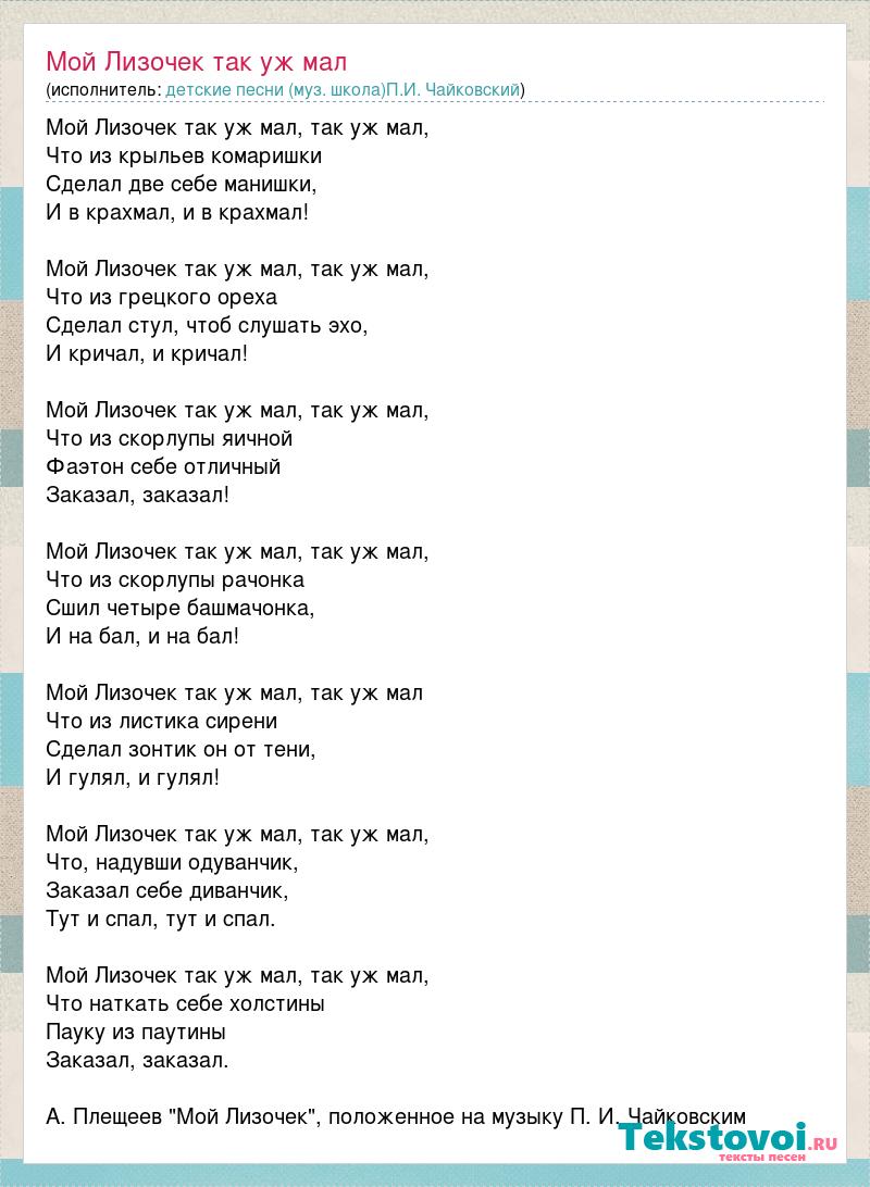 Мой Лизочек так уж мал, так уж мал, Что из крыльев комаришки Сделал две себе манишки, И в крахмал, и в крахмал! Мой Лизочек так уж мал, так уж мал, Что из грецкого ореха Сделал стул, чтоб слушать эхо, И кричал, и кричал! Мой Лизочек так уж мал, так уж мал, Что из скорлупы яичной Фаэтон себе отличный Заказал, заказал! Мой Лизочек так уж мал, так уж мал, Что из скорлупы рачонка Сшил четыре башмачонка, И на бал, и на бал! Мой Лизочек так уж мал, так уж мал Что из листика сирени Сделал зонтик он от тени, И гулял, и гулял! Мой Лизочек так уж мал, так уж мал, Что, надувши одуванчик, Заказал себе диванчик, Тут и спал, тут и спал. Мой Лизочек так уж мал, так уж мал, Что наткать себе холстины Пауку из паутины Заказал, заказал. А. Плещеев "Мой Лизочек", положенное на музыку П. И. Чайковским