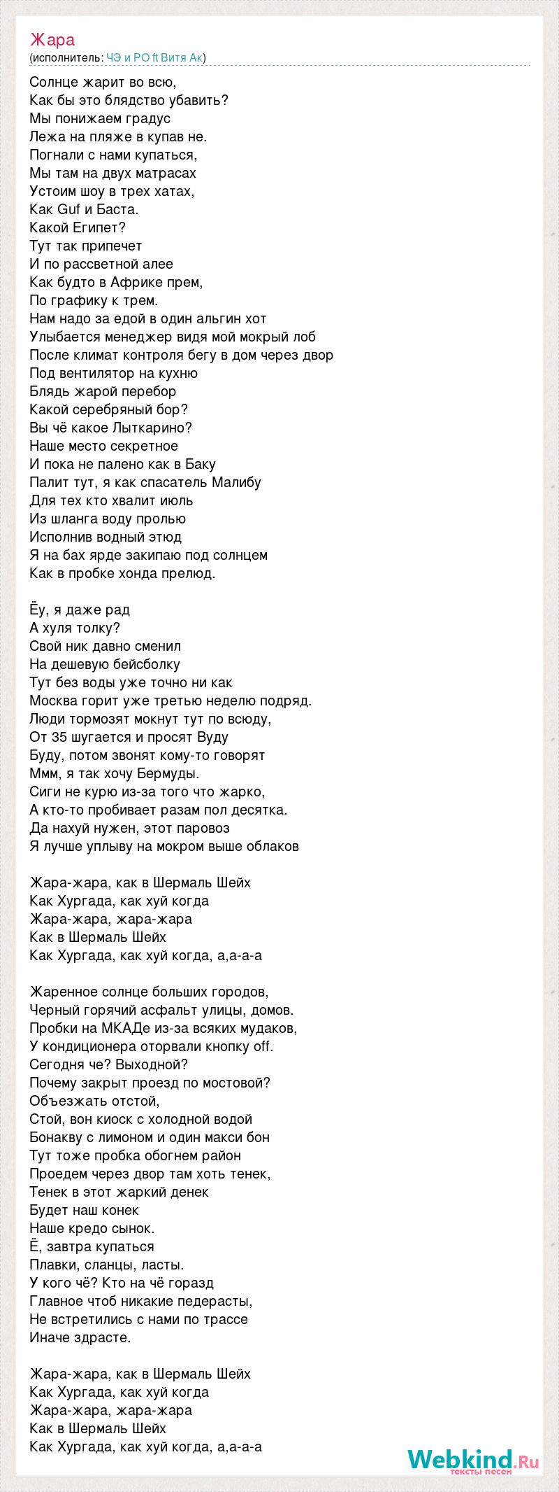 Солнце жарит во всю, Как бы это блядство убавить? Мы понижаем градус Лежа на пляже в купав не. Погнали с нами купаться, Мы там на двух матрасах Устоим шоу в трех хатах, Как Guf и Баста. Какой Египет? Тут так припечет И по рассветной алее Как будто в Африке прем, По графику к трем. Нам надо за едой в один альгин хот Улыбается менеджер видя мой мокрый лоб После климат контроля бегу в дом через двор Под вентилятор на кухню Блядь жарой перебор Какой серебряный бор? Вы чё какое Лыткарино? Наше место секретное И пока не палено как в Баку Палит тут, я как спасатель Малибу Для тех кто хвалит июль Из шланга воду пролью Исполнив водный этюд Я на бах ярде закипаю под солнцем Как в пробке хонда прелюд. Ёу, я даже рад А хуля толку? Свой ник давно сменил На дешевую бейсболку Тут без воды уже точно ни как Москва горит уже третью неделю подряд. Люди тормозят мокнут тут по всюду, От 35 шугается и просят Вуду Буду, потом звонят кому-то говорят Ммм, я так хочу Бермуды. Сиги не курю из-за того что жарко, А кто-то пробивает разам пол десятка. Да нахуй нужен, этот паровоз Я лучше уплыву на мокром выше облаков Жара-жара, как в Шермаль Шейх Как Хургада, как хуй когда Жара-жара, жара-жара Как в Шермаль Шейх Как Хургада, как хуй когда, а,а-а-а Жаренное солнце больших городов, Черный горячий асфальт улицы, домов. Пробки на МКАДе из-за всяких мудаков, У кондиционера оторвали кнопку оff. Сегодня че? Выходной? Почему закрыт проезд по мостовой? Объезжать отстой, Стой, вон киоск с холодной водой Бонакву с лимоном и один макси бон Тут тоже пробка обогнем район Проедем через двор там хоть тенек, Тенек в этот жаркий денек Будет наш конек Наше кредо сынок. Ё, завтра купаться Плавки, сланцы, ласты. У кого чё? Кто на чё горазд Главное чтоб никакие педерасты, Не встретились с нами по трассе Иначе здрасте. Жара-жара, как в Шермаль Шейх Как Хургада, как хуй когда Жара-жара, жара-жара Как в Шермаль Шейх Как Хургада, как хуй когда, а,а-а-а