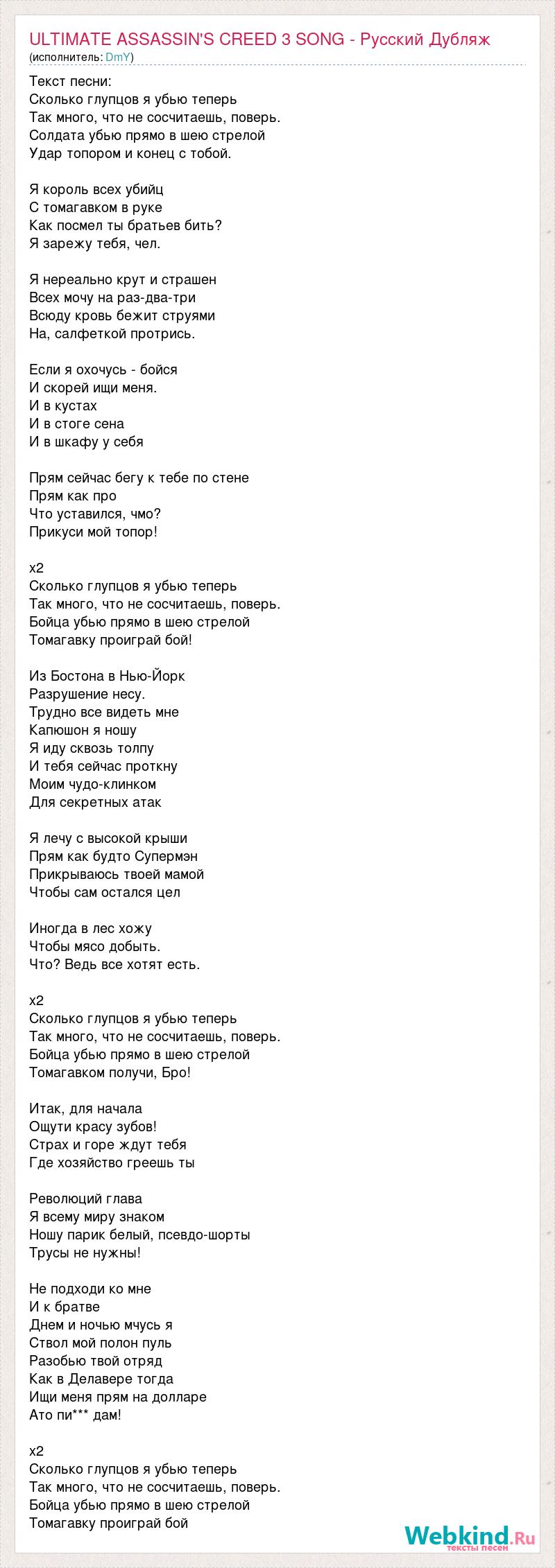 Текст песни: Сколько глупцов я убью теперь Так много, что не сосчитаешь, поверь. Солдата убью прямо в шею стрелой Удар топором и конец с тобой. Я король всех убийц С томагавком в руке Как посмел ты братьев бить? Я зарежу тебя, чел. Я нереально крут и страшен Всех мочу на раз-два-три Всюду кровь бежит струями На, салфеткой протрись. Если я охочусь - бойся И скорей ищи меня. И в кустах И в стоге сена И в шкафу у себя Прям сейчас бегу к тебе по стене Прям как про Что уставился, чмо? Прикуси мой топор! х2 Сколько глупцов я убью теперь Так много, что не сосчитаешь, поверь. Бойца убью прямо в шею стрелой Томагавку проиграй бой! Из Бостона в Нью-Йорк Разрушение несу. Трудно все видеть мне Капюшон я ношу Я иду сквозь толпу И тебя сейчас проткну Моим чудо-клинком Для секретных атак Я лечу с высокой крыши Прям как будто Супермэн Прикрываюсь твоей мамой Чтобы сам остался цел Иногда в лес хожу Чтобы мясо добыть. Что? Ведь все хотят есть. х2 Сколько глупцов я убью теперь Так много, что не сосчитаешь, поверь. Бойца убью прямо в шею стрелой Томагавком получи, Бро! Итак, для начала Ощути красу зубов! Страх и горе ждут тебя Где хозяйство греешь ты Революций глава Я всему миру знаком Ношу парик белый, псевдо-шорты Трусы не нужны! Не подходи ко мне И к братве Днем и ночью мчусь я Ствол мой полон пуль Разобью твой отряд Как в Делавере тогда Ищи меня прям на долларе Ато пи*** дам! х2 Сколько глупцов я убью теперь Так много, что не сосчитаешь, поверь. Бойца убью прямо в шею стрелой Томагавку проиграй бой
