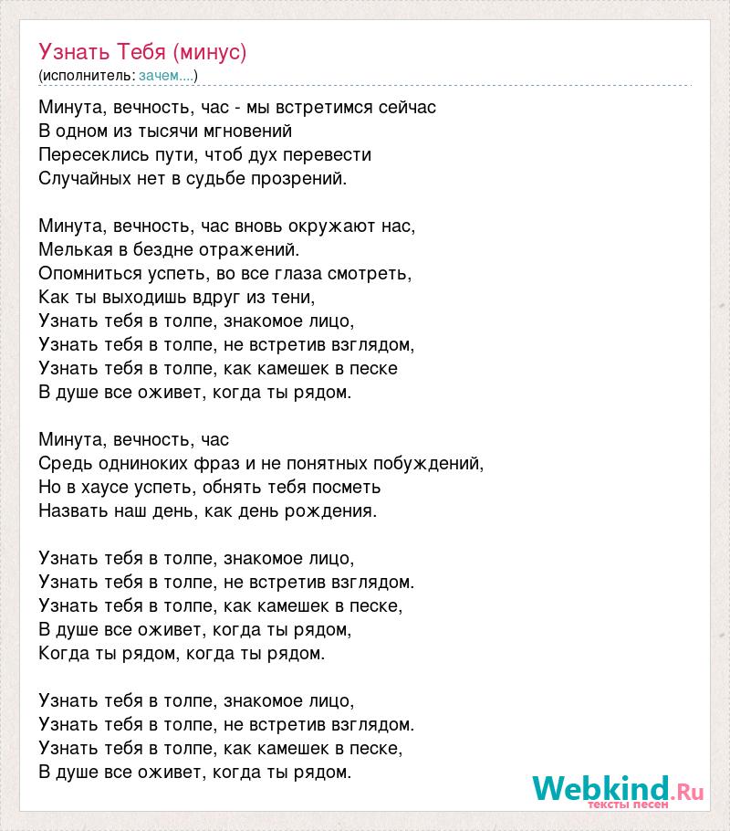 Минута, вечность, час - мы встретимся сейчас В одном из тысячи мгновений Пересеклись пути, чтоб дух перевести Случайных нет в судьбе прозрений. Минута, вечность, час вновь окружают нас, Мелькая в бездне отражений. Опомниться успеть, во все глаза смотреть, Как ты выходишь вдруг из тени, Узнать тебя в толпе, знакомое лицо, Узнать тебя в толпе, не встретив взглядом, Узнать тебя в толпе, как камешек в песке В душе все оживет, когда ты рядом. Минута, вечность, час Средь одниноких фраз и не понятных побуждений, Но в хаусе успеть, обнять тебя посметь Назвать наш день, как день рождения. Узнать тебя в толпе, знакомое лицо, Узнать тебя в толпе, не встретив взглядом. Узнать тебя в толпе, как камешек в песке, В душе все оживет, когда ты рядом, Когда ты рядом, когда ты рядом. Узнать тебя в толпе, знакомое лицо, Узнать тебя в толпе, не встретив взглядом. Узнать тебя в толпе, как камешек в песке, В душе все оживет, когда ты рядом.