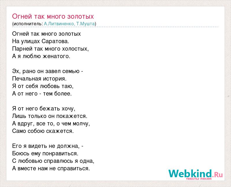 Огней так много золотых На улицах Саратова. Парней так много холостых, А я люблю женатого. Эх, рано он завел семью - Печальная история. Я от себя любовь таю, А от него - тем более. Я от него бежать хочу, Лишь только он покажется. А вдруг, все то, о чем молчу, Само собою скажется. Его я видеть не должна, - Боюсь ему понравиться. С любовью справлюсь я одна, А вместе нам не справиться.
