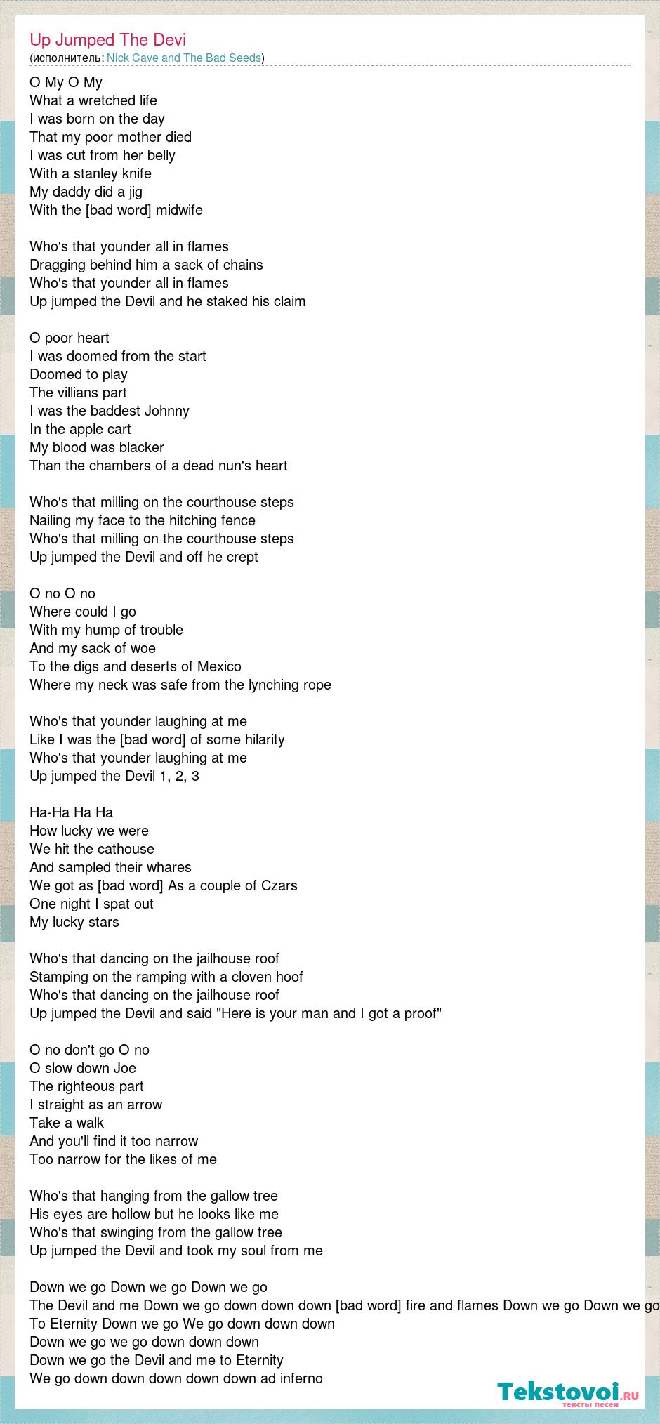 O My O My What a wretched life I was born on the day That my poor mother died I was cut from her belly With a stanley knife My daddy did a jig With the drunk midwife Who's that younder all in flames Dragging behind him a sack of chains Who's that younder all in flames Up jumped the Devil and he staked his claim O poor heart I was doomed from the start Doomed to play The villians part I was the baddest Johnny In the apple cart My blood was blacker Than the chambers of a dead nun's heart Who's that milling on the courthouse steps Nailing my face to the hitching fence Who's that milling on the courthouse steps Up jumped the Devil and off he crept O no O no Where could I go With my hump of trouble And my sack of woe To the digs and deserts of Mexico Where my neck was safe from the lynching rope Who's that younder laughing at me Like I was the brunt of some hilarity Who's that younder laughing at me Up jumped the Devil 1, 2, 3 Ha-Ha Ha Ha How lucky we were We hit the cathouse And sampled their whares We got as drunk As a couple of Czars One night I spat out My lucky stars Who's that dancing on the jailhouse roof Stamping on the ramping with a cloven hoof Who's that dancing on the jailhouse roof Up jumped the Devil and said "Here is your man and I got a proof" O no don't go O no O slow down Joe The righteous part I straight as an arrow Take a walk And you'll find it too narrow Too narrow for the likes of me Who's that hanging from the gallow tree His eyes are hollow but he looks like me Who's that swinging from the gallow tree Up jumped the Devil and took my soul from me Down we go Down we go Down we go The Devil and me Down we go down down down Hell fire and flames Down we go Down we go To Eternity Down we go We go down down down Down we go we go down down down Down we go the Devil and me to Eternity We go down down down down down ad inferno