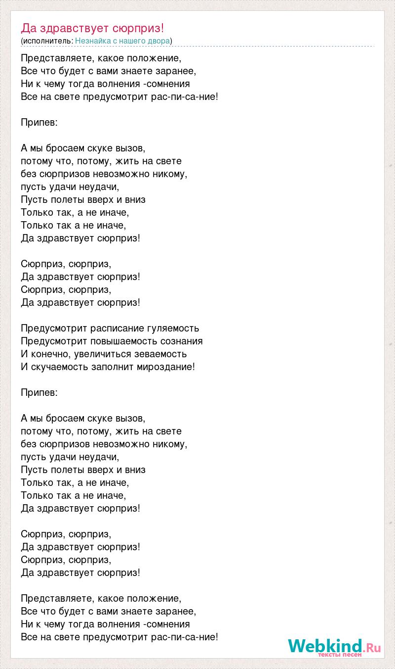 Представляете, какое положение, Все что будет с вами знаете заранее, Ни к чему тогда волнения -сомнения Все на свете предусмотрит рас-пи-са-ние! Припев: А мы бросаем скуке вызов, потому что, потому, жить на свете без сюрпризов невозможно никому, пусть удачи неудачи, Пусть полеты вверх и вниз Только так, а не иначе, Только так а не иначе, Да здравствует сюрприз! Сюрприз, сюрприз, Да здравствует сюрприз! Сюрприз, сюрприз, Да здравствует сюрприз! Предусмотрит расписание гуляемость Предусмотрит повышаемость сознания И конечно, увеличиться зеваемость И скучаемость заполнит мироздание! Припев: А мы бросаем скуке вызов, потому что, потому, жить на свете без сюрпризов невозможно никому, пусть удачи неудачи, Пусть полеты вверх и вниз Только так, а не иначе, Только так а не иначе, Да здравствует сюрприз! Сюрприз, сюрприз, Да здравствует сюрприз! Сюрприз, сюрприз, Да здравствует сюрприз! Представляете, какое положение, Все что будет с вами знаете заранее, Ни к чему тогда волнения -сомнения Все на свете предусмотрит рас-пи-са-ние!
